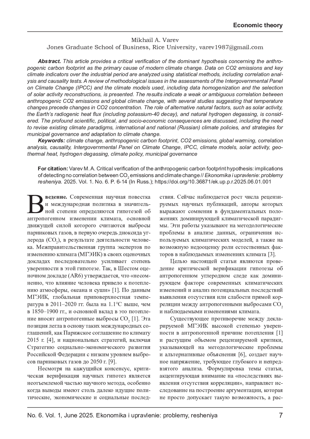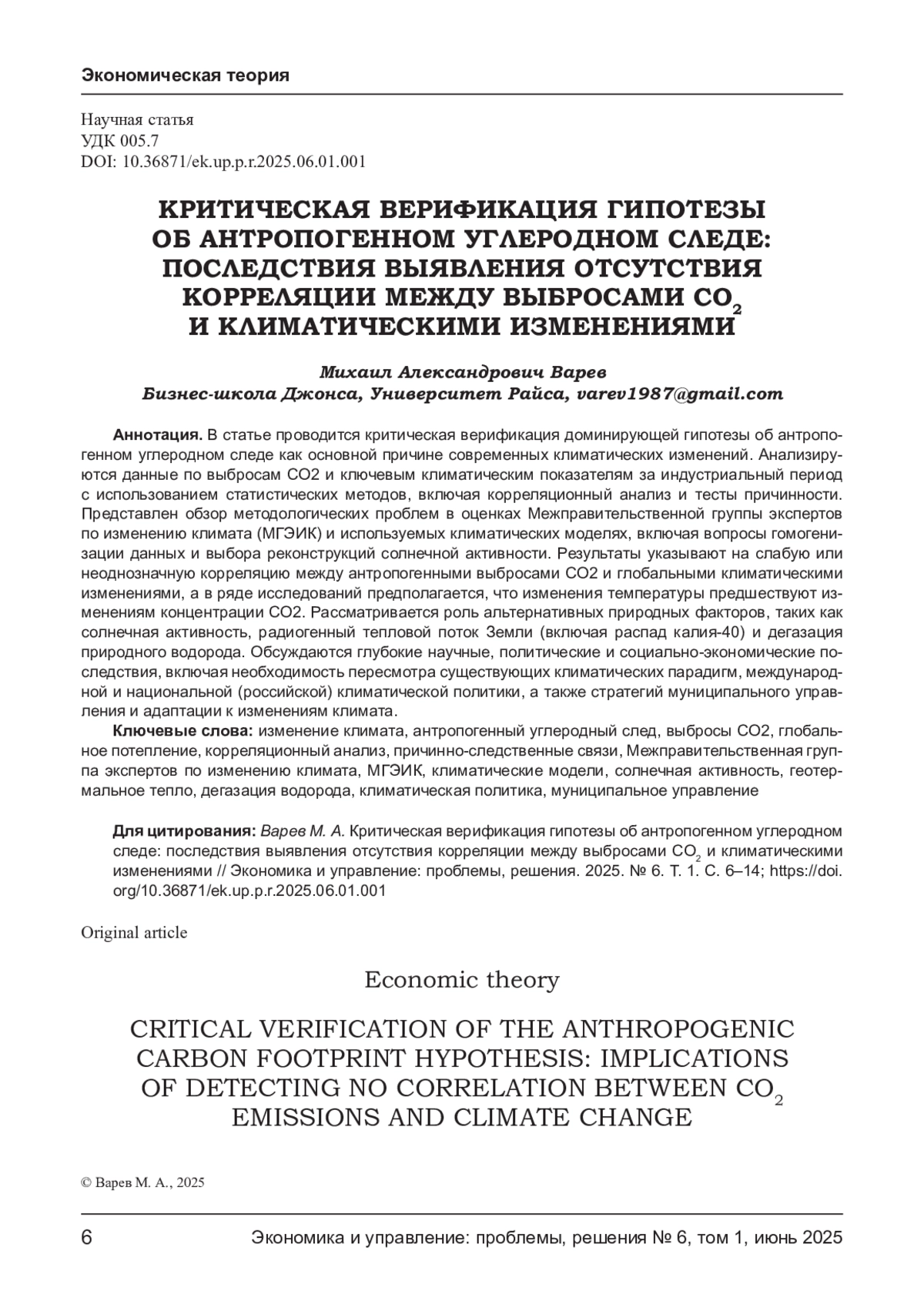 В статье проводится критическая верификация доминирующей гипотезы об антропогенном углеродном следе как основной причине современных климатических изменений. Анализируются данные по выбросам CO2 и ключевым климатическим показателям за индустриальный период с использованием статистических методов, включая корреляционный анализ и тесты причинности. Представлен обзор методологических проблем в оценках Межправительственной группы экспертов по изменению климата (МГЭИК) и используемых климатических моделях, включая вопросы гомогенизации данных и выбора реконструкций солнечной активности. Результаты указывают на слабую или неоднозначную корреляцию между антропогенными выбросами CO2 и глобальными климатическими изменениями, а в ряде исследований предполагается, что изменения температуры предшествуют изменениям концентрации CO2. Рассматривается роль альтернативных природных факторов, таких как солнечная активность, радиогенный тепловой поток Земли (включая распад калия-40) и дегазация природного водорода. Обсуждаются глубокие научные, политические и социально-экономические последствия, включая необходимость пересмотра существующих климатических парадигм, международной и национальной (российской) климатической политики, а также стратегий муниципального управления и адаптации к изменениям климата.