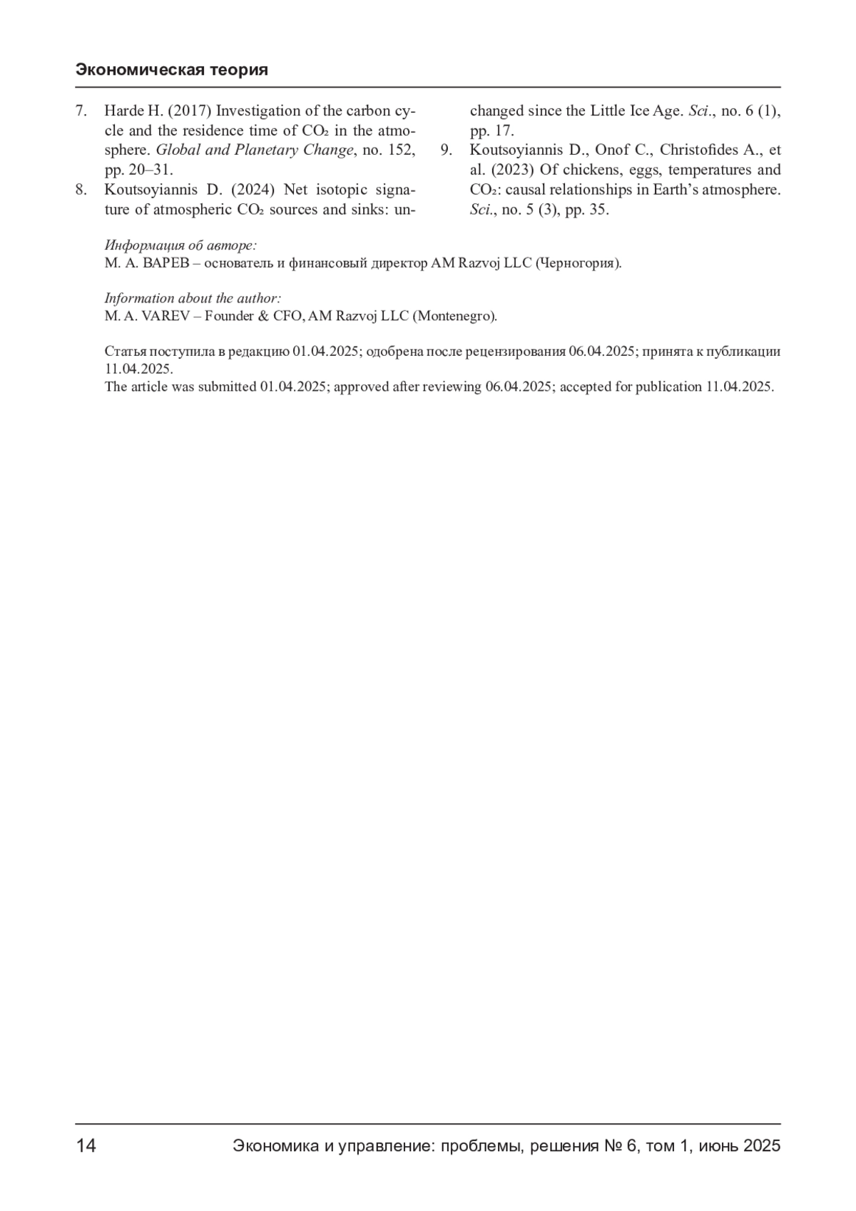7. Harde H. (2017) Investigation of the carbon cycle and the residence time of CO₂ in the atmosphere. Global and Planetary Change, no. 152, pp. 20-31.