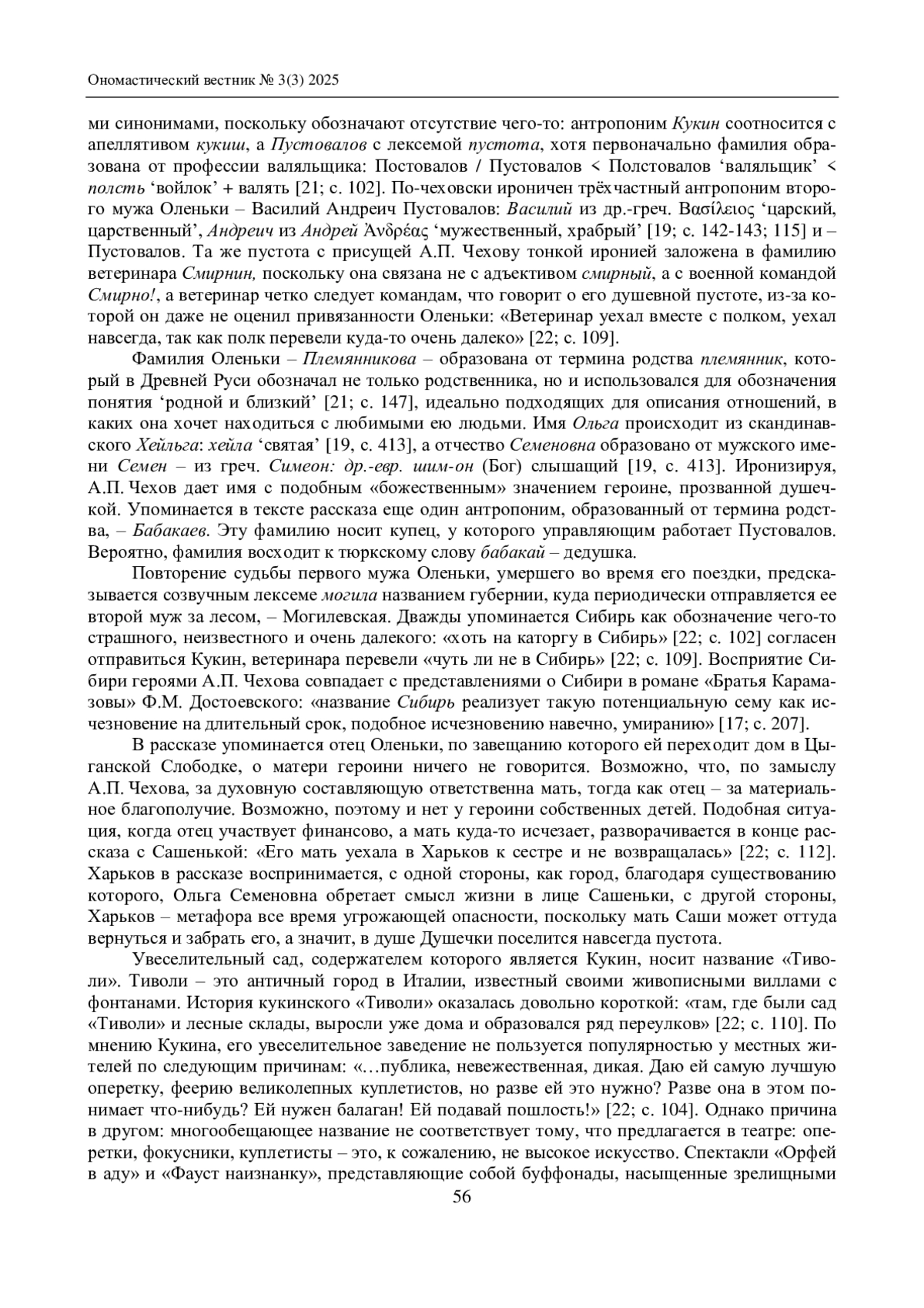 Статья посвящена исследованию ономастического пространства чеховского рассказа «Душечка», выяв-лению роли имен собственных в формировании образа главной героини – Оленьки Племянниковой – и других персонажей. Отмечается, что А. П. Чехов придавал значение именам, продумывал антропонимы и топонимы, в связи с чем они несут в тексте рассказа определенную смысловую нагрузку. Рассмотрение ономастикона начинается с анализа библионима «Душечка», который предопределяет выбор не только онимных, но и апеллятивных элементов с диминутивными суффиксами. Анализируются также топонимы и другие онимные единицы, встречающиеся в тексте, отмечается, что имена собственные способствуют созданию атмосферы провинциального городка конца XIX века и углубляют понимание психологических особенностей персонажей.