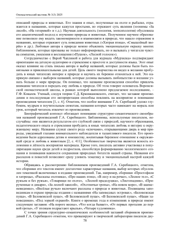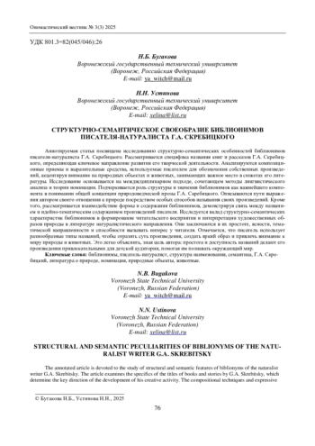 Аннотируемая статья посвящена исследованию структурно-семантических особенностей библионимов писателя-натуралиста Г. А. Скребицкого. Рассматривается специфика названия книг и рассказов Г. А. Скребицкого, определяющая ключевое направление развития его творческой деятельности. Анализируются композиционные приемы и выразительные средства, используемые писателем для обозначения собственных произведений, акцентируя внимание на природных объектах и животных, занимающих важное место в сюжетах его лите-ратуры. Исследование основывается на междисциплинарном подходе, сочетающем методы лингвистического анализа и теории номинации. Подчеркивается роль структуры и значения библионимов как важнейшего компонента в понимании общей концепции природоведческой прозы Г. А. Скребицкого. Описываются пути выражения автором своего отношения к природе посредством особых способов называния своих произведений. Кроме того, рассматривается взаимодействие формы и содержания библионимов, демонстрируя связь между названием и идейно-тематическим содержанием произведений писателя. Исследуется вклад структурно-семантических характеристик библионимов в формирование читательского восприятия и интерпретации художественных образов природы в литературе натуралистического направления. Они заключаются в их простоте, ясности, тематической направленности и способности вызывать интерес у читателя. Отмечается, что писатель использует разнообразные типы названий, чтобы отразить суть произведения, создать яркий образ и привлечь внимание к миру природы и животных. Это легко объяснить, зная цель автора: простота и доступность названий делают его произведения привлекательными для детской аудитории, помогая им познавать окружающий мир.