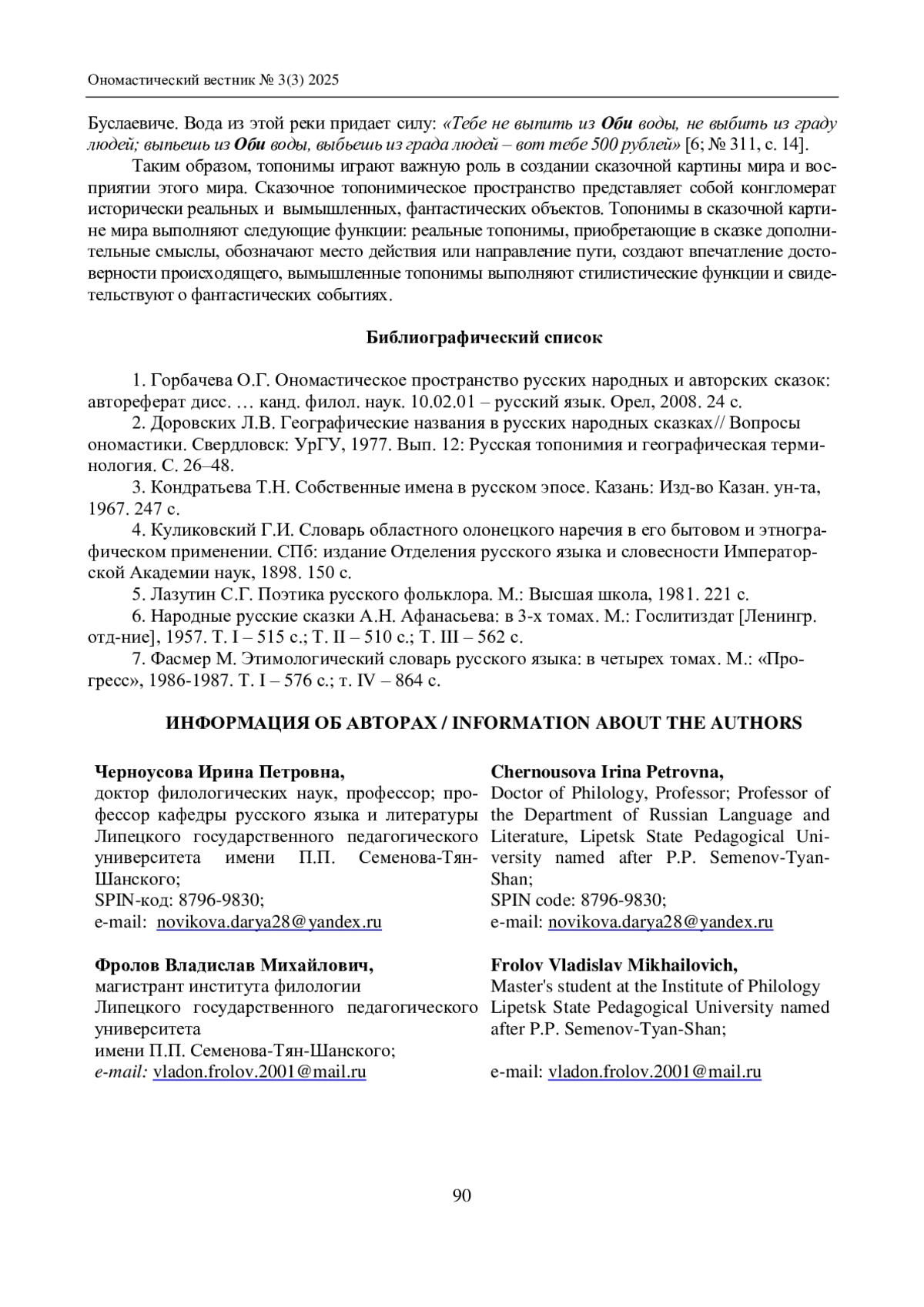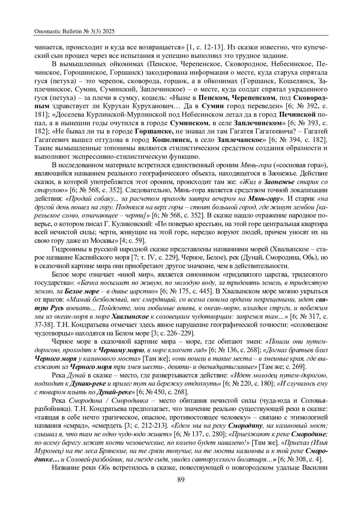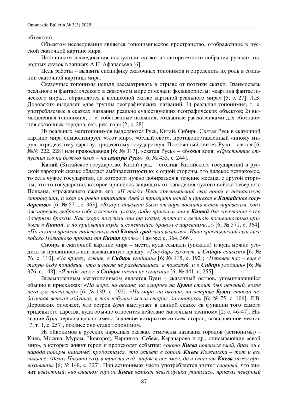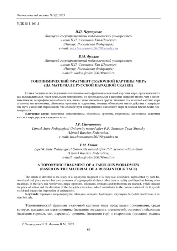 ЧЕРНОУСОВА И. П., ФРОЛОВ В. М. ТОПОНИМИЧЕСКИЙ ФРАГМЕНТ СКАЗОЧНОЙ КАРТИНЫ МИРА (НА МАТЕРИАЛЕ РУССКОЙ НАРОДНОЙ СКАЗКИ) // ОНОМАСТИЧЕСКИЙ ВЕСТНИК. 2025. № 3 (3)