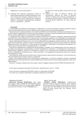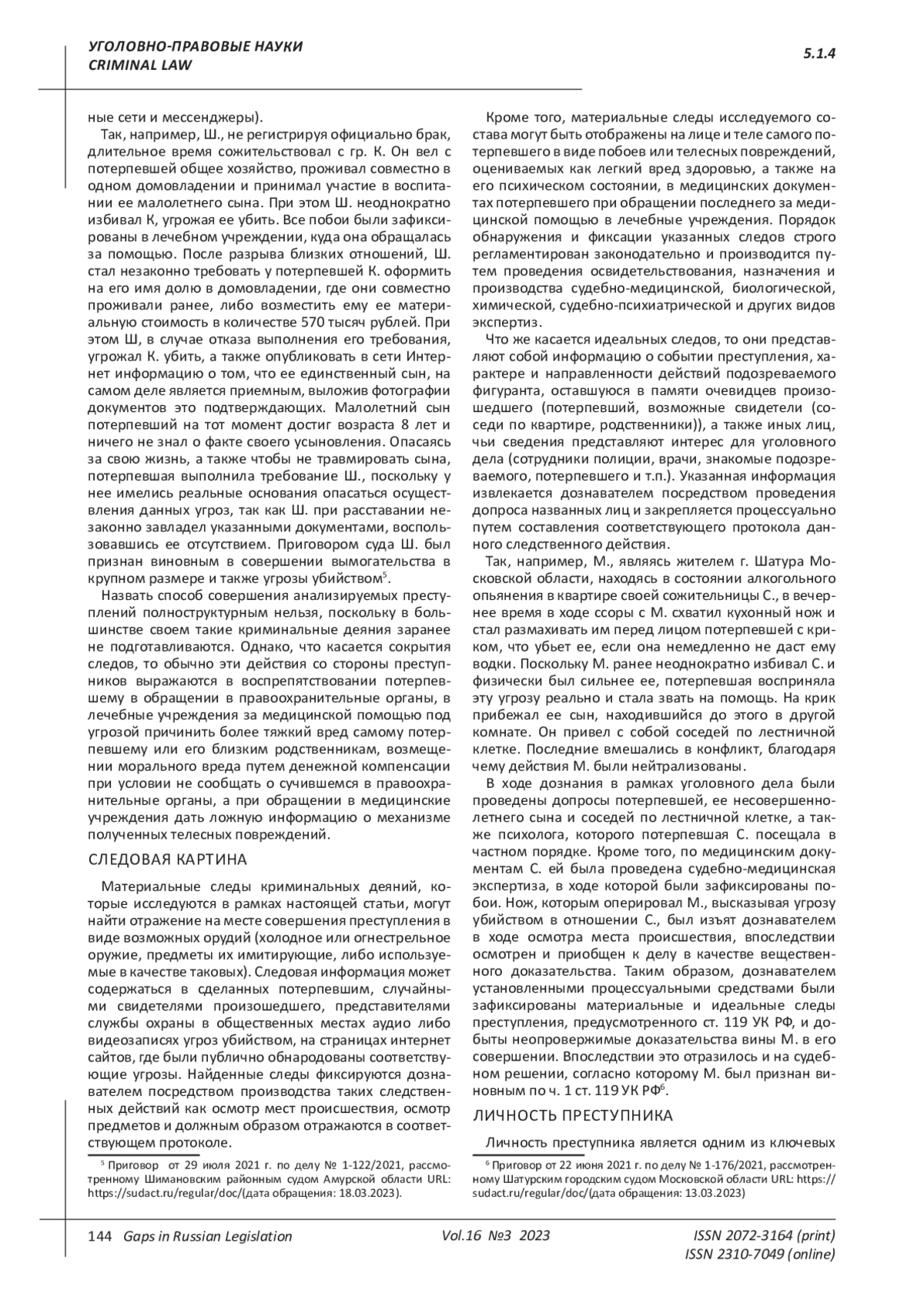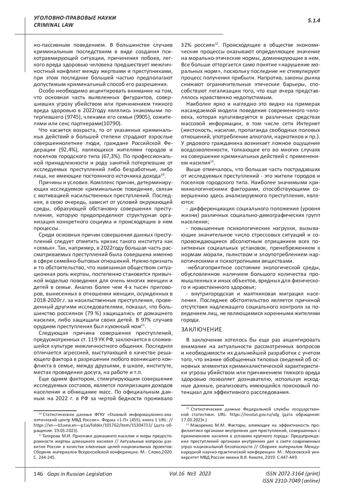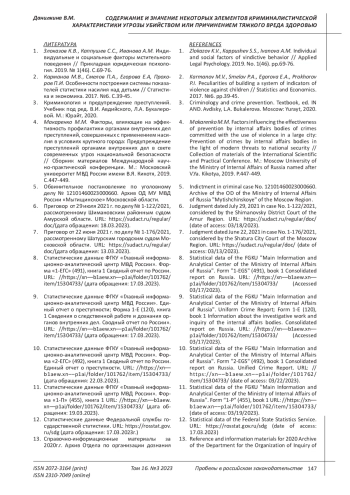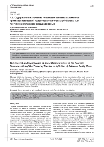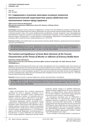 Статья: СОДЕРЖАНИЕ И ЗНАЧЕНИЕ НЕКОТОРЫХ ОСНОВНЫХ ЭЛЕМЕНТОВ КРИМИНАЛИСТИЧЕСКОЙ ХАРАКТЕРИСТИКИ УГРОЗЫ УБИЙСТВОМ ИЛИ ПРИЧИНЕНИЕМ ТЯЖКОГО ВРЕДА ЗДОРОВЬЮ (2023)