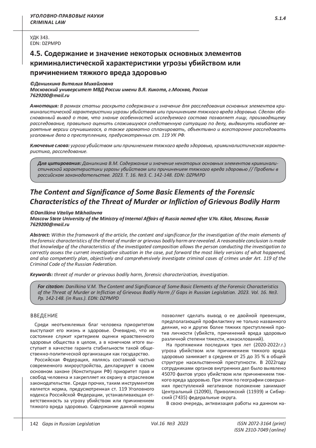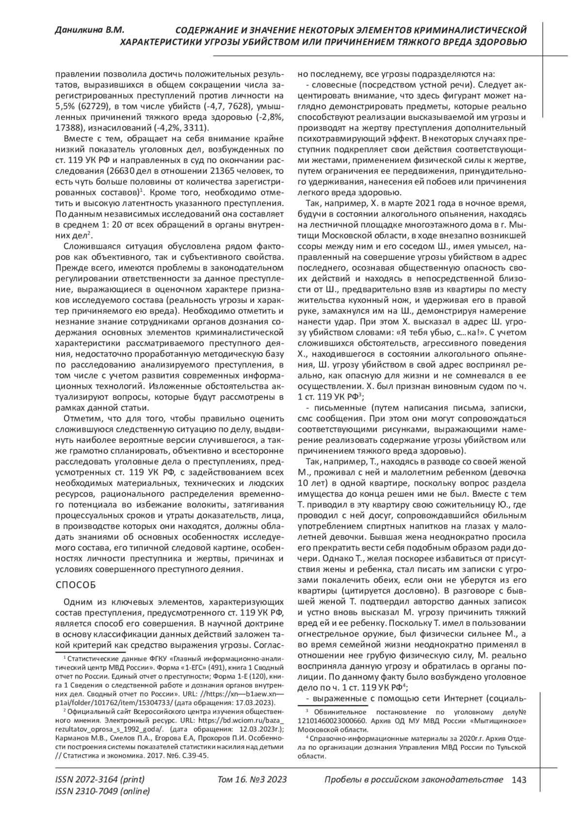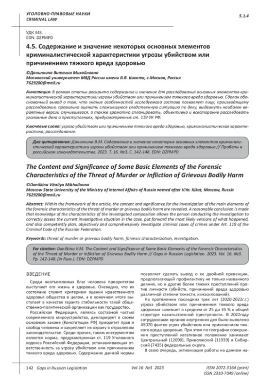 ДАНИЛКИНА В. М. СОДЕРЖАНИЕ И ЗНАЧЕНИЕ НЕКОТОРЫХ ОСНОВНЫХ ЭЛЕМЕНТОВ КРИМИНАЛИСТИЧЕСКОЙ ХАРАКТЕРИСТИКИ УГРОЗЫ УБИЙСТВОМ ИЛИ ПРИЧИНЕНИЕМ ТЯЖКОГО ВРЕДА ЗДОРОВЬЮ // ПРОБЕЛЫ В РОССИЙСКОМ ЗАКОНОДАТЕЛЬСТВЕ. 2023. Т. 16 № 3