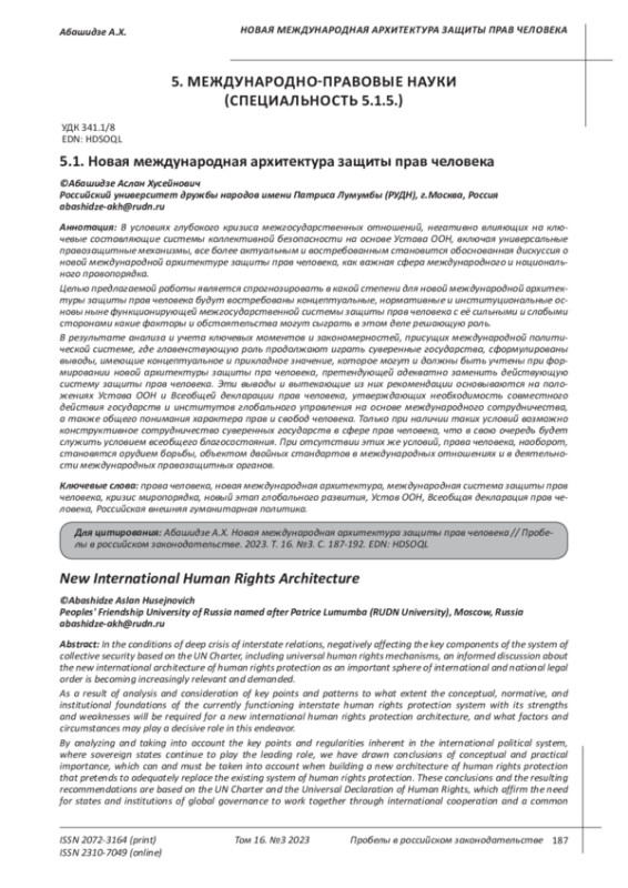 В условиях глубокого кризиса межгосударственных отношений, негативно влияющих на ключевые составляющие системы коллективной безопасности на основе Устава ООН, включая универсальные правозащитные механизмы, все более актуальным и востребованным становится обоснованная дискуссия о новой международной архитектуре защиты прав человека, как важная сфера международного и национального правопорядка. Целью предлагаемой работы является спрогнозировать в какой степени для новой международной архитектуры защиты прав человека будут востребованы концептуальные, нормативные и институциональные основы ныне функционирующей межгосударственной системы защиты прав человека с её сильными и слабыми сторонами какие факторы и обстоятельства могут сыграть в этом деле решающую роль. В результате анализа и учета ключевых моментов и закономерностей, присущих международной политической системе, где главенствующую роль продолжают играть суверенные государства, сформулированы выводы, имеющие концептуальное и прикладное значение, которое могут и должны быть учтены при формировании новой архитектуры защиты пра человека, претендующей адекватно заменить действующую систему защиты прав человека. Эти выводы и вытекающие из них рекомендации основываются на положениях Устава ООН и Всеобщей декларации прав человека, утверждающих необходимость совместного действия государств и институтов глобального управления на основе международного сотрудничества, а также общего понимания характера прав и свобод человека. Только при наличии таких условий возможно конструктивное сотрудничество суверенных государств в сфере прав человека, что в свою очередь будет служить условием всеобщего благосостояния. При отсутствии этих же условий, права человека, наоборот, становятся орудием борьбы, объектом двойных стандартов в международных отношениях и в деятельности международных правозащитных органов.