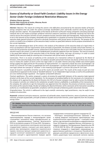 Статья: ПРЕВЫШЕНИЕ ПОЛНОМОЧИЙ ИЛИ ДОБРОСОВЕСТНОЕ ПОВЕДЕНИЕ: ВОПРОСЫ ОТВЕТСТВЕННОСТИ В СФЕРЕ ЭНЕРГЕТИКИ В УСЛОВИЯХ ИНОСТРАННЫХ ОДНОСТОРОННИХ ОГРАНИЧИТЕЛЬНЫХ МЕР (2023)