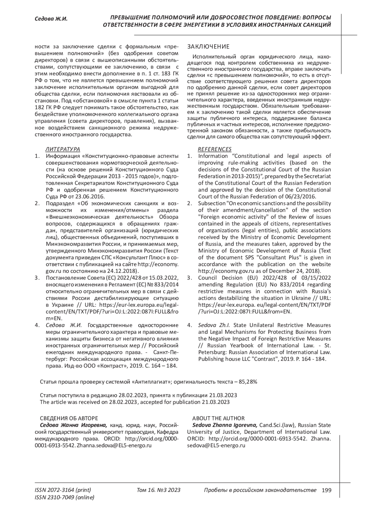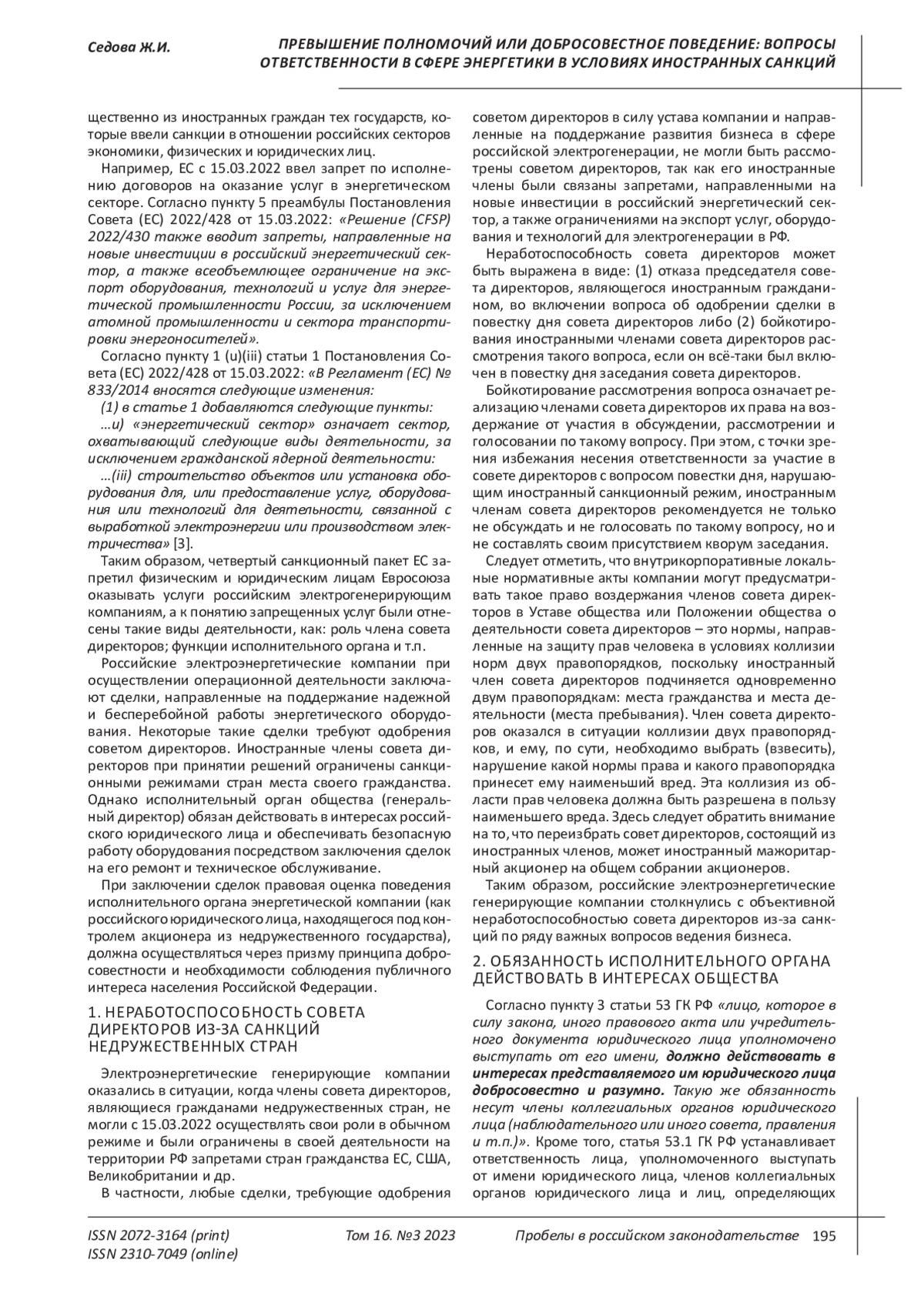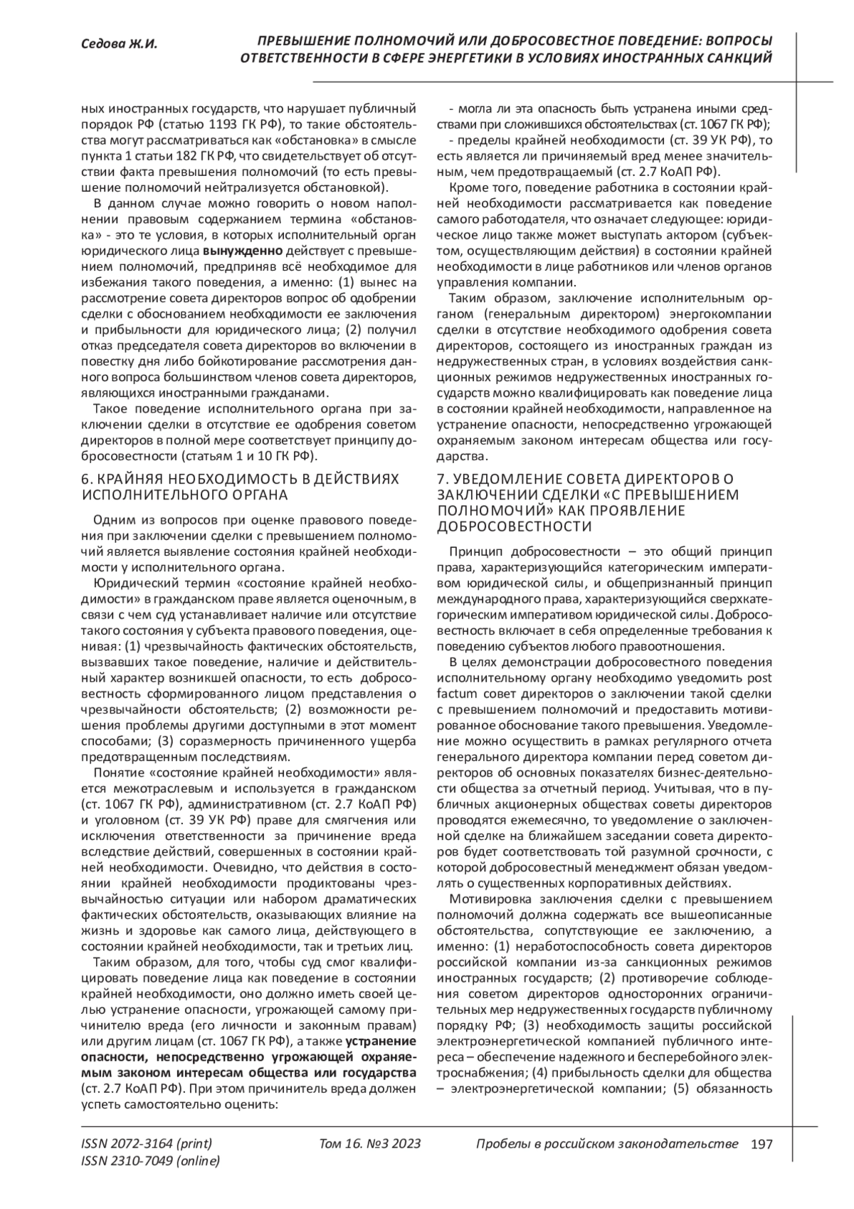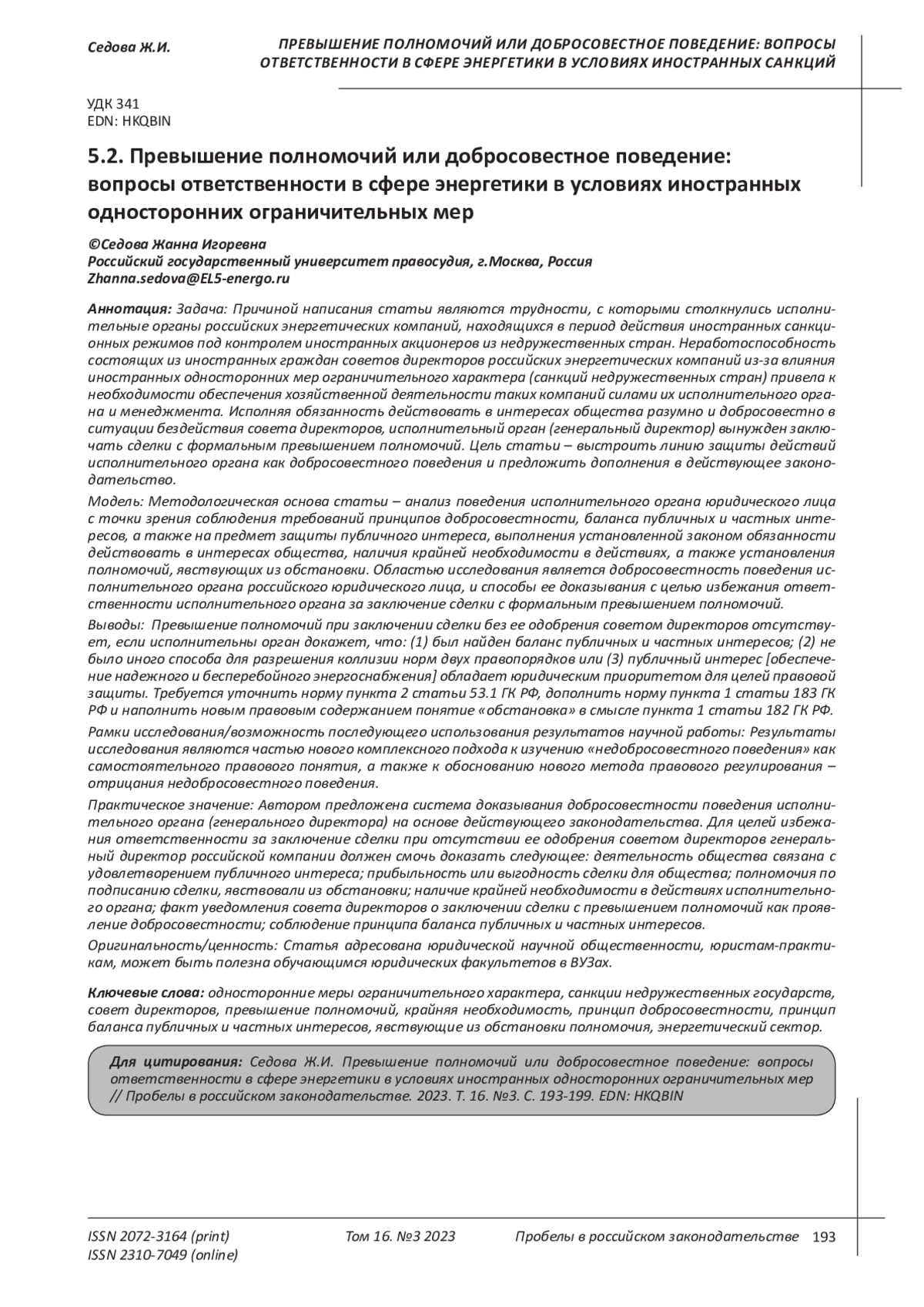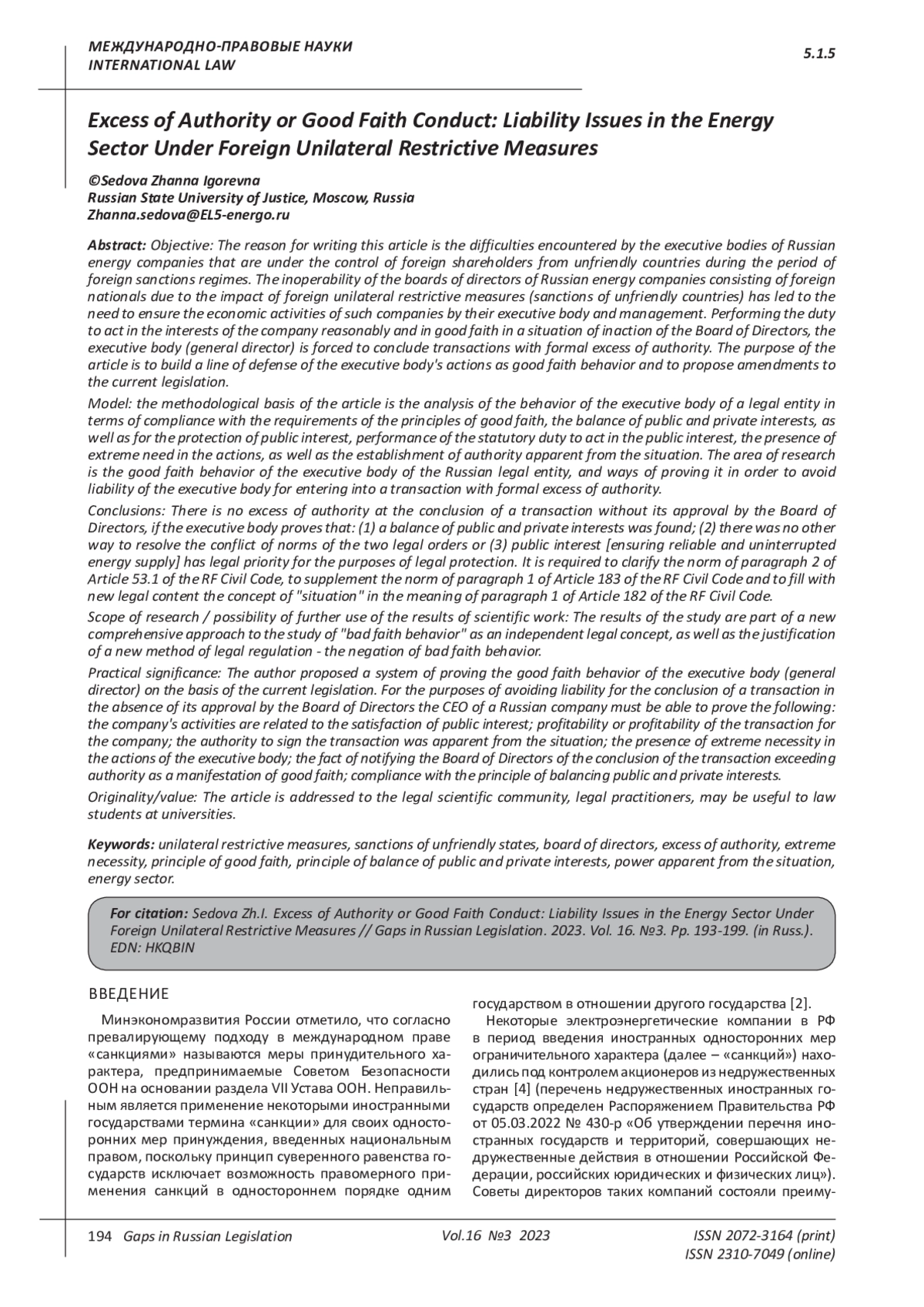 СЕДОВА Ж. И. ПРЕВЫШЕНИЕ ПОЛНОМОЧИЙ ИЛИ ДОБРОСОВЕСТНОЕ ПОВЕДЕНИЕ: ВОПРОСЫ ОТВЕТСТВЕННОСТИ В СФЕРЕ ЭНЕРГЕТИКИ В УСЛОВИЯХ ИНОСТРАННЫХ ОДНОСТОРОННИХ ОГРАНИЧИТЕЛЬНЫХ МЕР // ПРОБЕЛЫ В РОССИЙСКОМ ЗАКОНОДАТЕЛЬСТВЕ. 2023. Т. 16 № 3