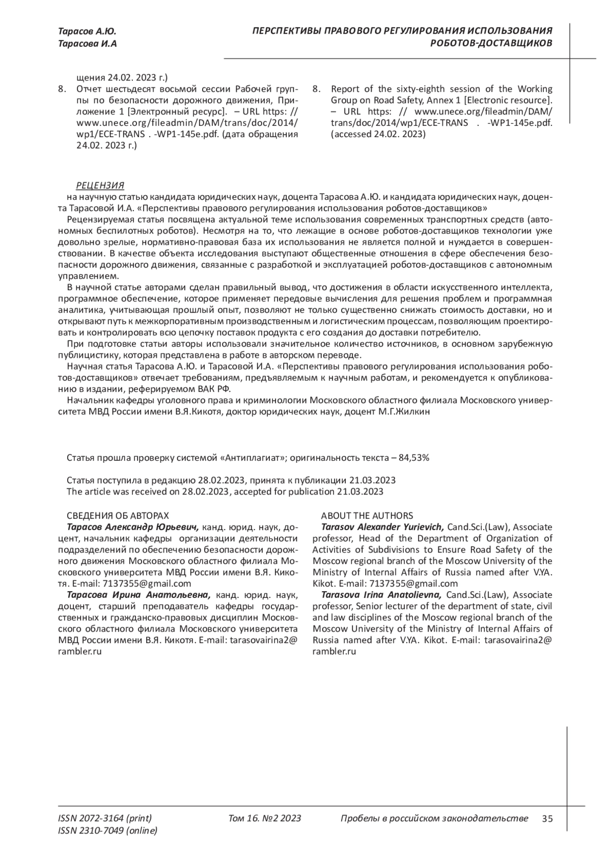 7. Басу, С.; Омотубора, А.; Бисон, М.; Фокс, К. Правовая база для малых автономных сельскохозяйственных роботов [Электронный ресурс]. - URL https: //link.springer.com/content/pdf/10.1007%2Fs00146-018-0846-4.pdf. (дата обращения 24.02. 2023 г.).