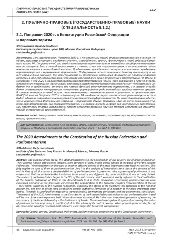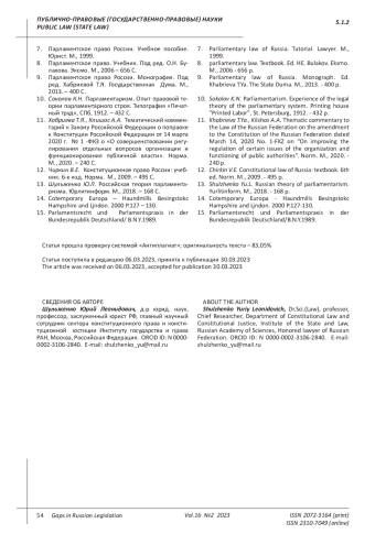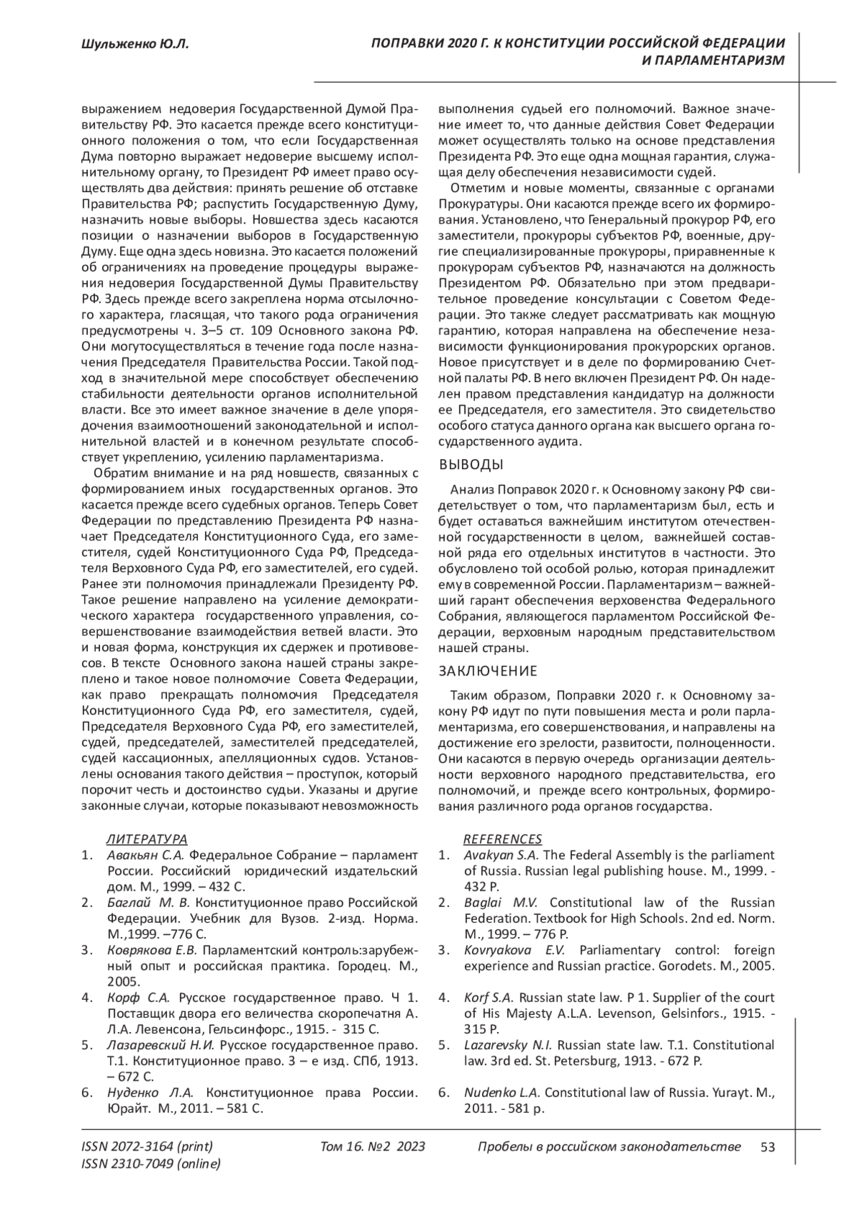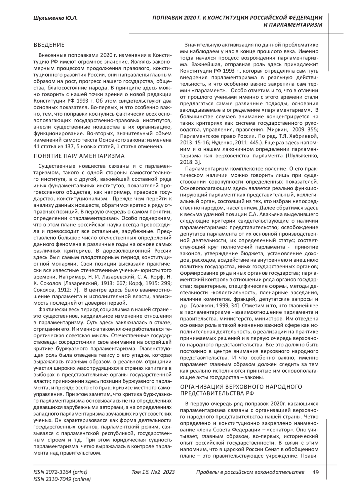 ШУЛЬЖЕНКО Ю. Л. ПОПРАВКИ 2020 Г. К КОНСТИТУЦИИ РОССИЙСКОЙ ФЕДЕРАЦИИ И ПАРЛАМЕНТАРИЗМ // ПРОБЕЛЫ В РОССИЙСКОМ ЗАКОНОДАТЕЛЬСТВЕ. 2023. Т. 16 № 2