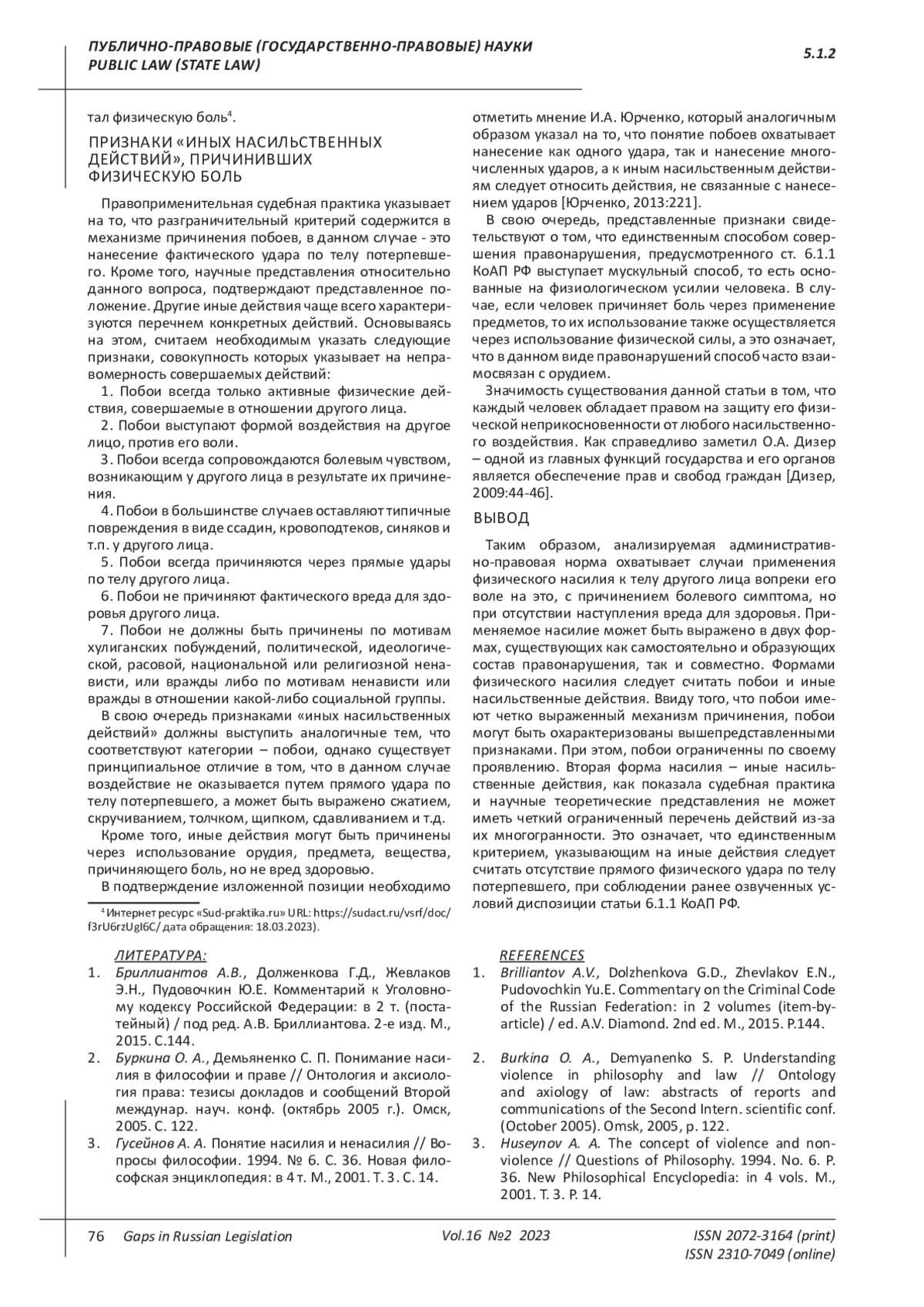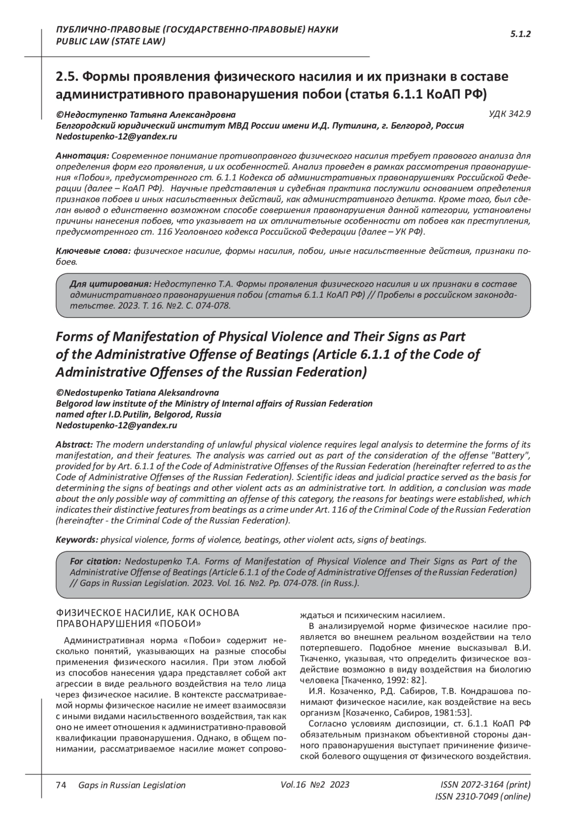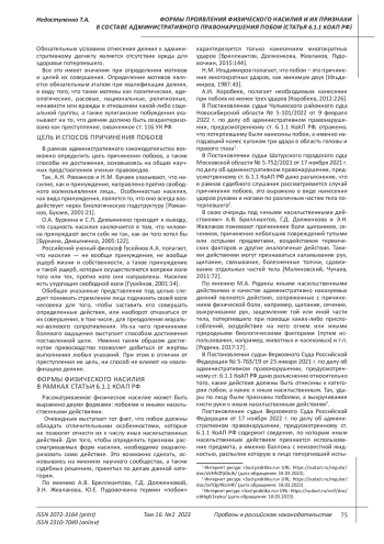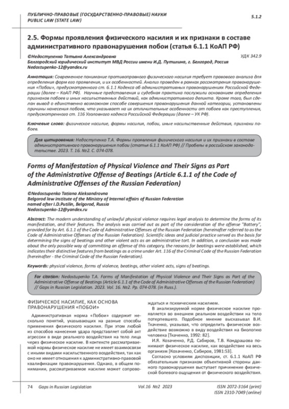 НЕДОСТУПЕНКО Т. А. ФОРМЫ ПРОЯВЛЕНИЯ ФИЗИЧЕСКОГО НАСИЛИЯ И ИХ ПРИЗНАКИ В СОСТАВЕ АДМИНИСТРАТИВНОГО ПРАВОНАРУШЕНИЯ ПОБОИ (СТАТЬЯ 6.1.1 КОАП РФ) // ПРОБЕЛЫ В РОССИЙСКОМ ЗАКОНОДАТЕЛЬСТВЕ. 2023. Т. 16 № 2