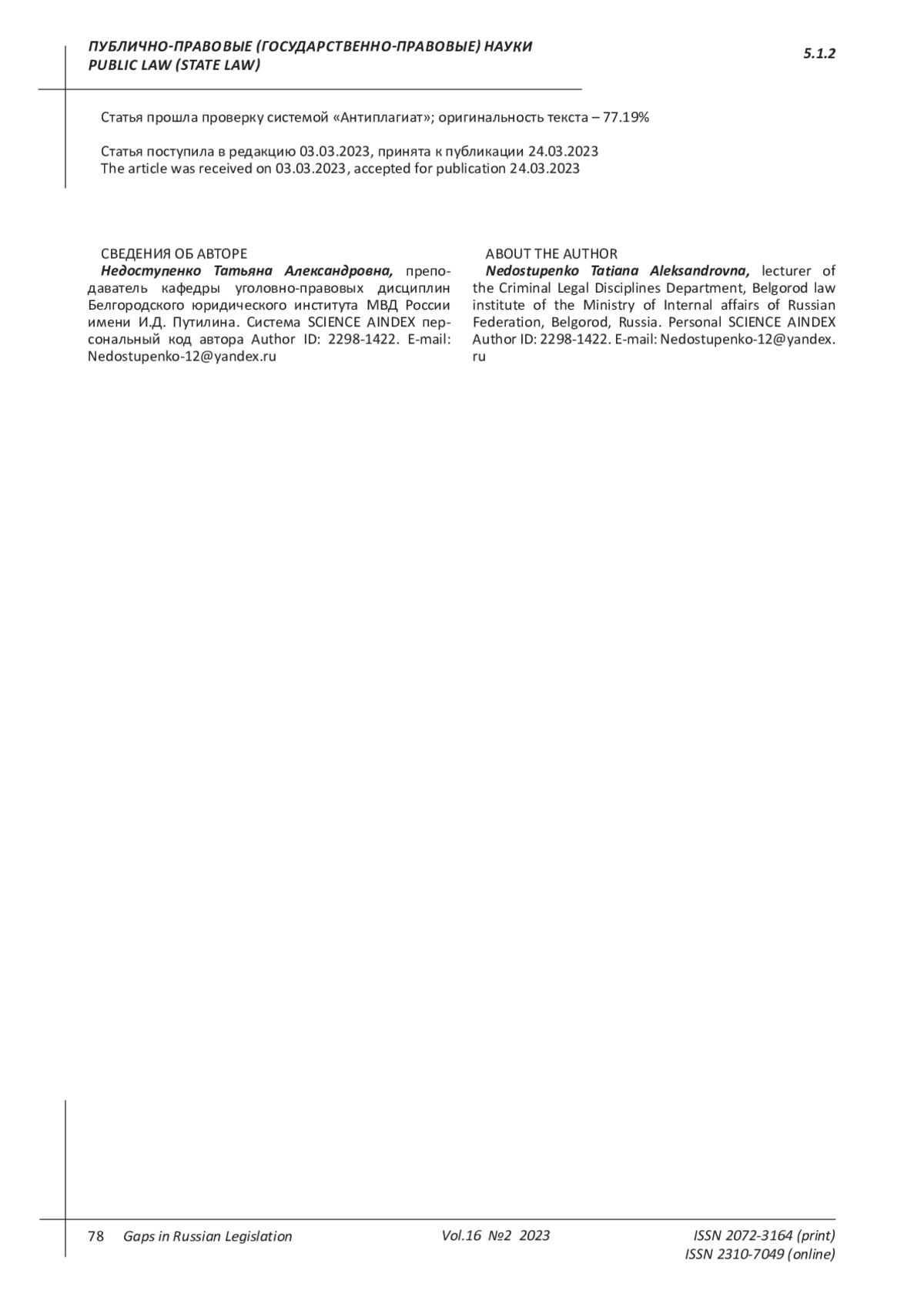 Журнал: ПРОБЕЛЫ В РОССИЙСКОМ ЗАКОНОДАТЕЛЬСТВЕ