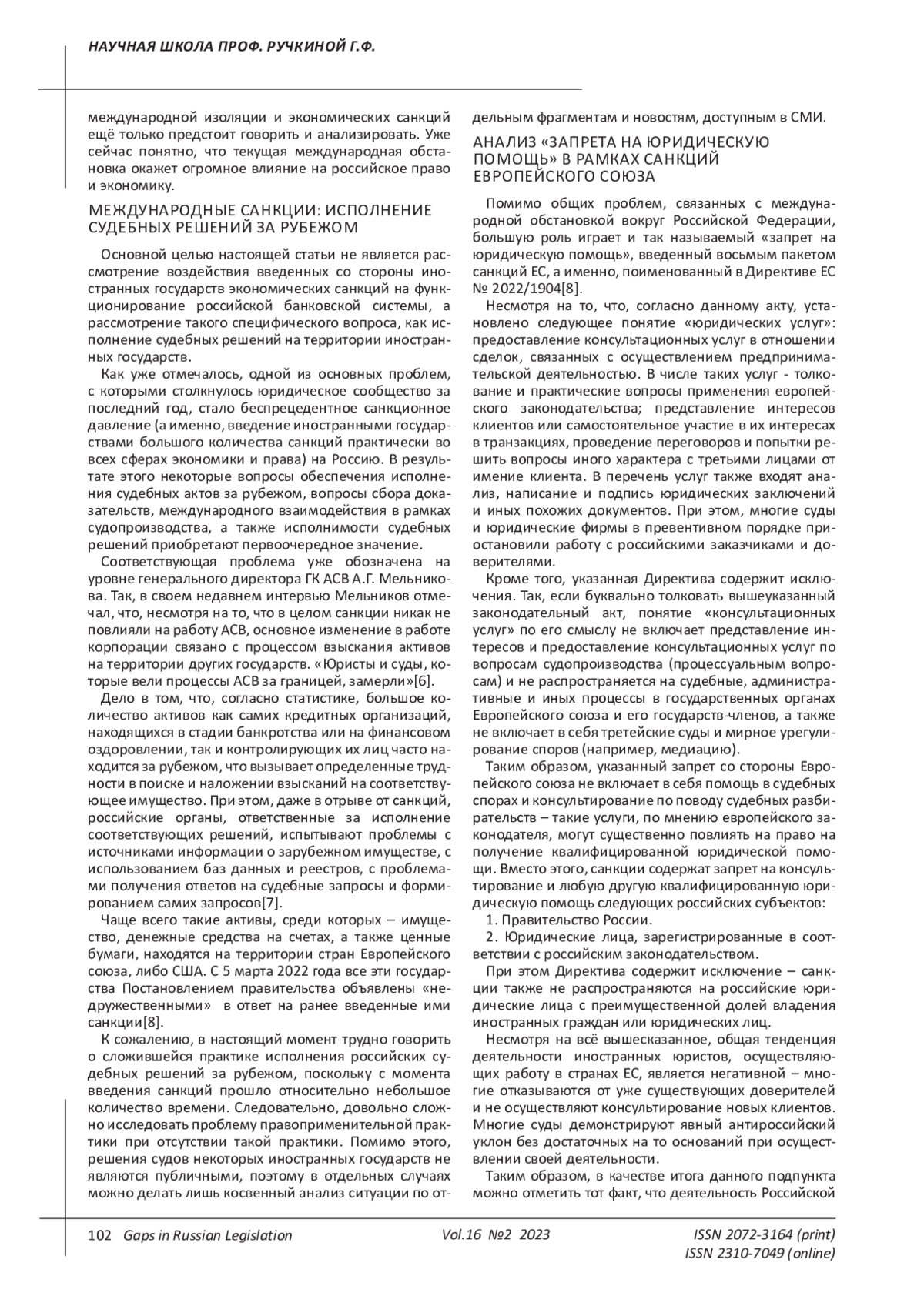 Основной целью настоящей статьи не является рассмотрение воздействия введенных со стороны иностранных государств экономических санкций на функционирование российской банковской системы, а рассмотрение такого специфического вопроса, как исполнение судебных решений на территории иностранных государств. Как уже отмечалось, одной из основных проблем, с которыми столкнулось юридическое сообщество за последний год, стало беспрецедентное санкционное давление (а именно, введение иностранными государствами большого количества санкций практически во всех сферах экономики и права) на Россию. В результате этого некоторые вопросы обеспечения исполнения судебных актов за рубежом, вопросы сбора доказательств, международного взаимодействия в рамках судопроизводства, а также исполнимости судебных решений приобретают первоочередное значение.