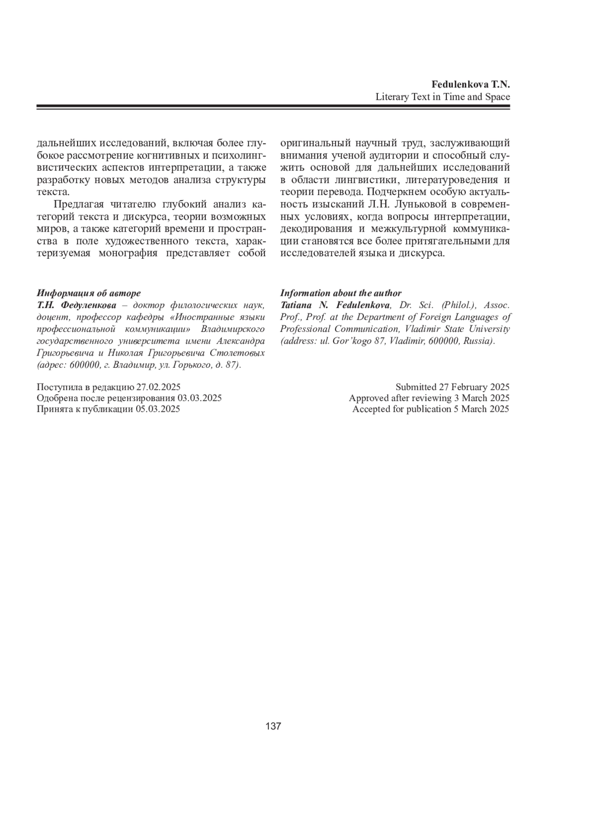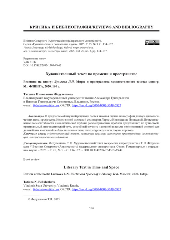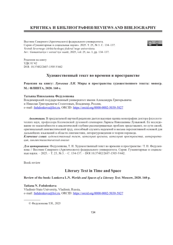 ФЕДУЛЕНКОВА Т. Н. ХУДОЖЕСТВЕННЫЙ ТЕКСТ ВО ВРЕМЕНИ И ПРОСТРАНСТВЕ // ВЕСТНИК СЕВЕРНОГО (АРКТИЧЕСКОГО) ФЕДЕРАЛЬНОГО УНИВЕРСИТЕТА. СЕРИЯ: ГУМАНИТАРНЫЕ И СОЦИАЛЬНЫЕ НАУКИ. 2025. Т. 25 № 3