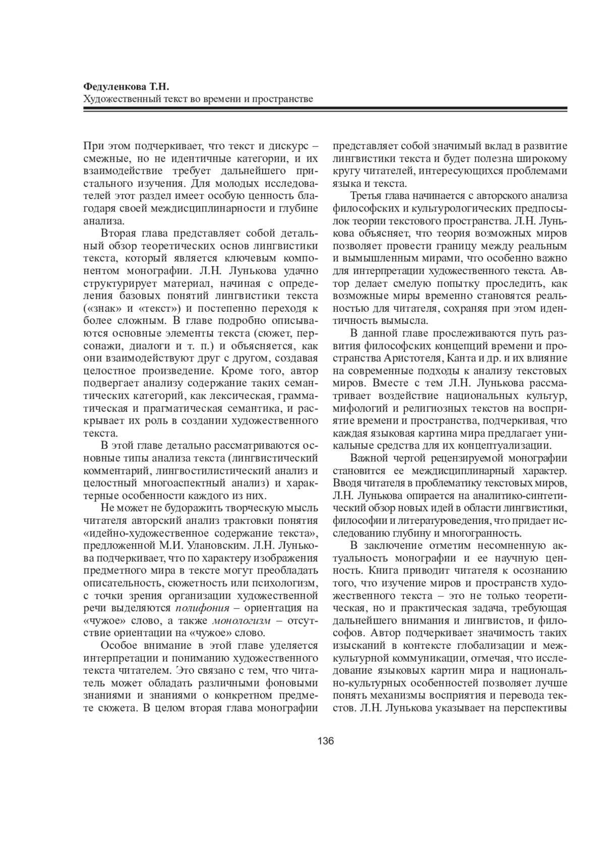 В предлагаемой научной рецензии дается высокая оценка монографии доктора филологических наук, профессора Коломенской духовной семинарии Ларисы Николаевны Луньковой. Ее исследование по масштабности и аналитической глубине рассматриваемых проблем представляет, по сути своей, оригинальный лингвистический труд, способный служить надежной и весьма перспективной основой для дальнейших изысканий в области лингвистики, литературоведения и теории перевода.
