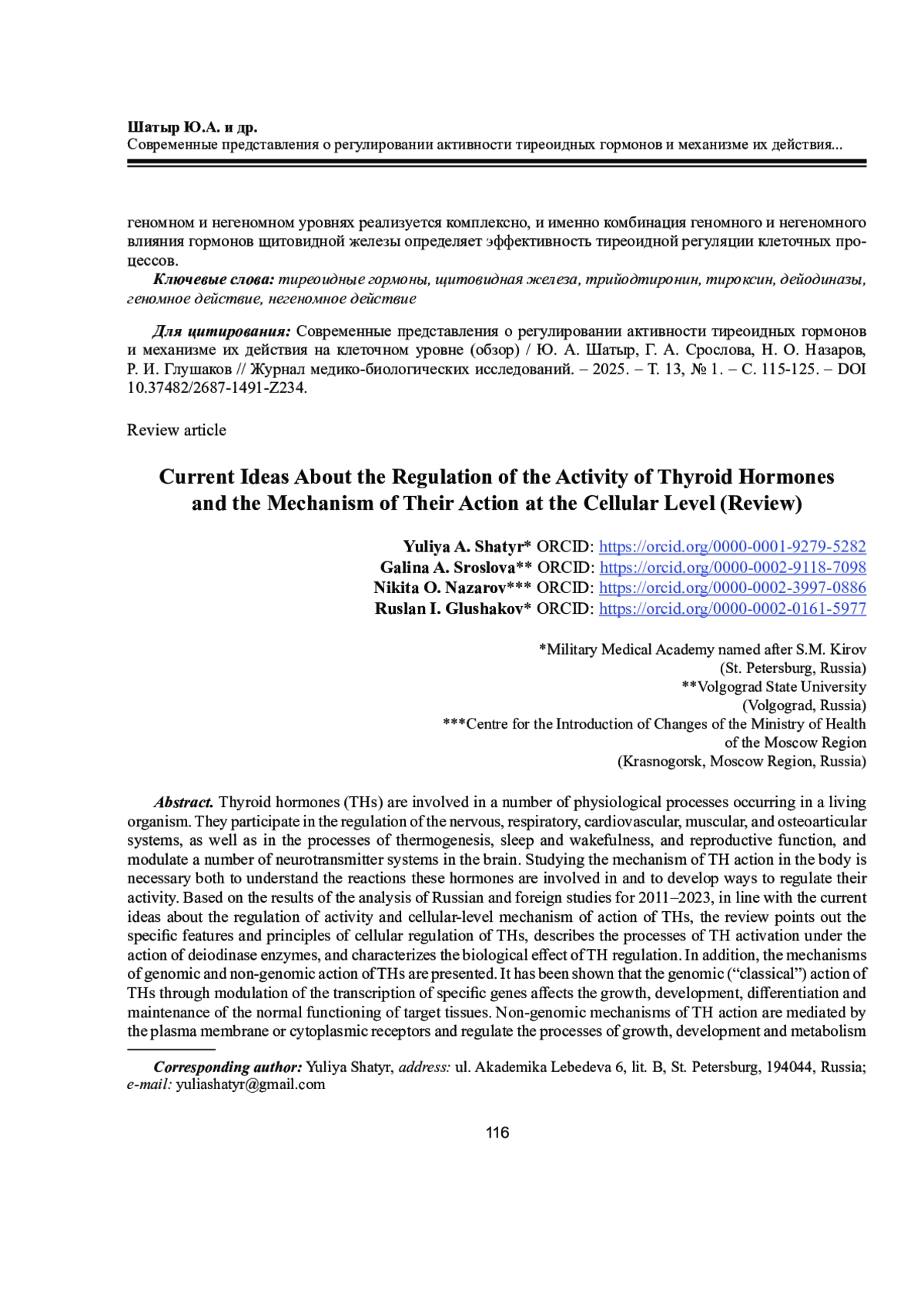 26. Селиванова Е.К., Тарасова О.С. Негеномное действие тиреоидных гормонов: роль в регуляции сосудистой системы // Вестн. Моск. ун-та. Сер. 16: Биология. 2020. Т. 75, No 4. С. 226-236. EDN: YAYCOB