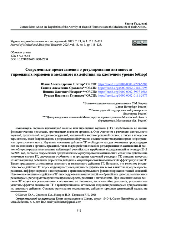 5. Tedeschi L., Vassalle C., Iervasi G., Sabatino L. Main Factors Involved in Thyroid Hormone Action // Molecules. 2021. Vol. 26, No 23. Art. No 7337. DOI: 10.3390/molecules26237337 EDN: ZRNIXT