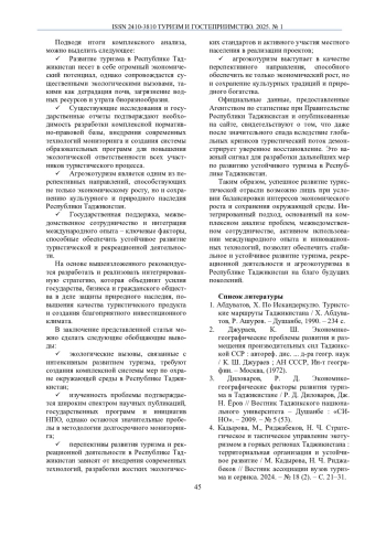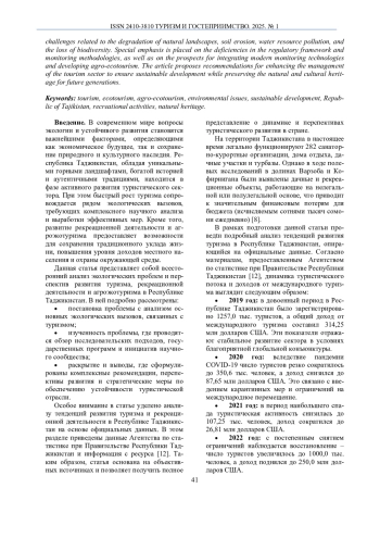 Статья: ЭКОЛОГИЧЕСКИЕ ПРОБЛЕМЫ И ПЕРСПЕКТИВЫ РАЗВИТИЯ ТУРИЗМА, РЕКРЕАЦИОННОЙ ДЕЯТЕЛЬНОСТИ И АГРОЭКОТУРИЗМА В РЕСПУБЛИКЕ ТАДЖИКИСТАН (2025)