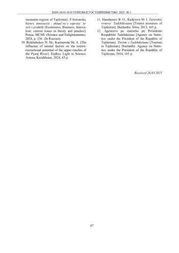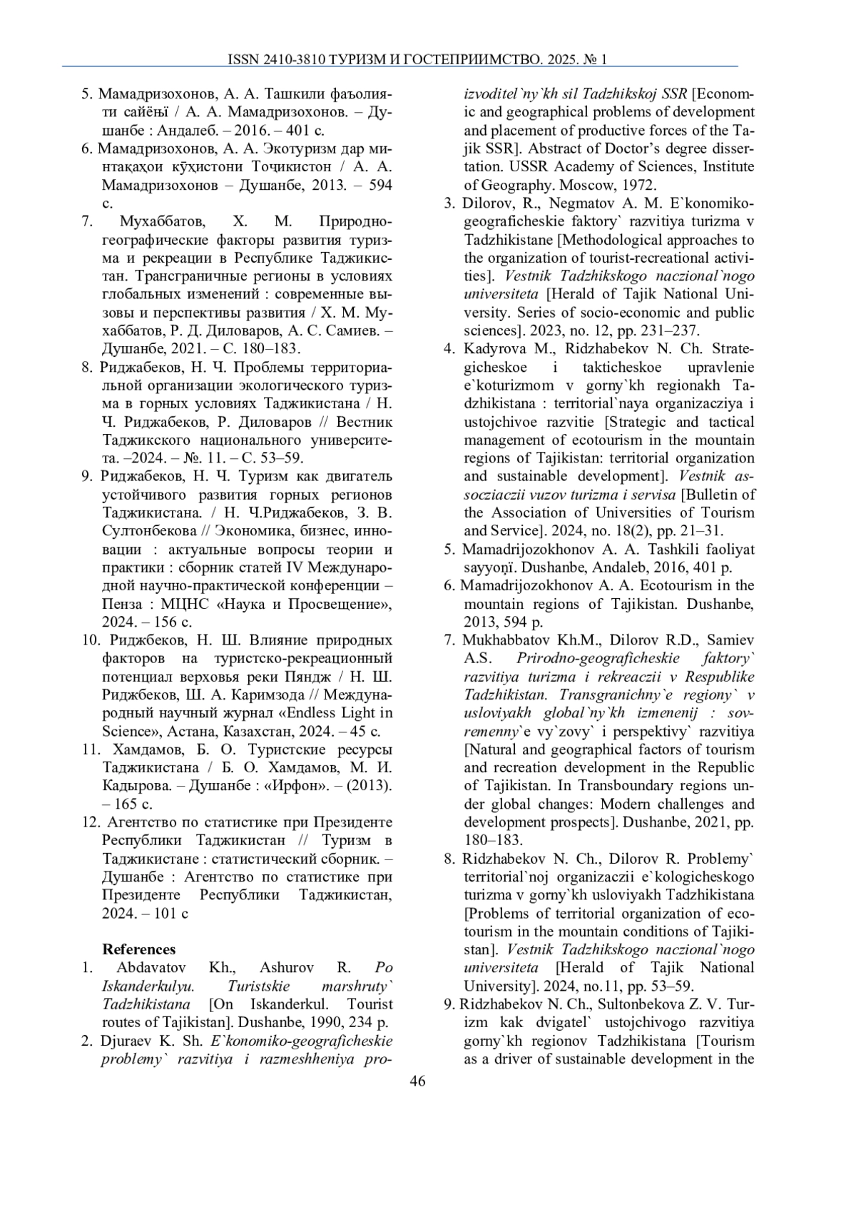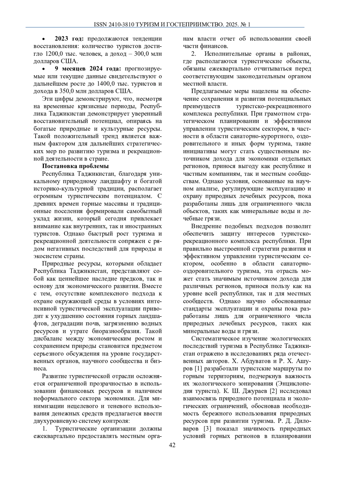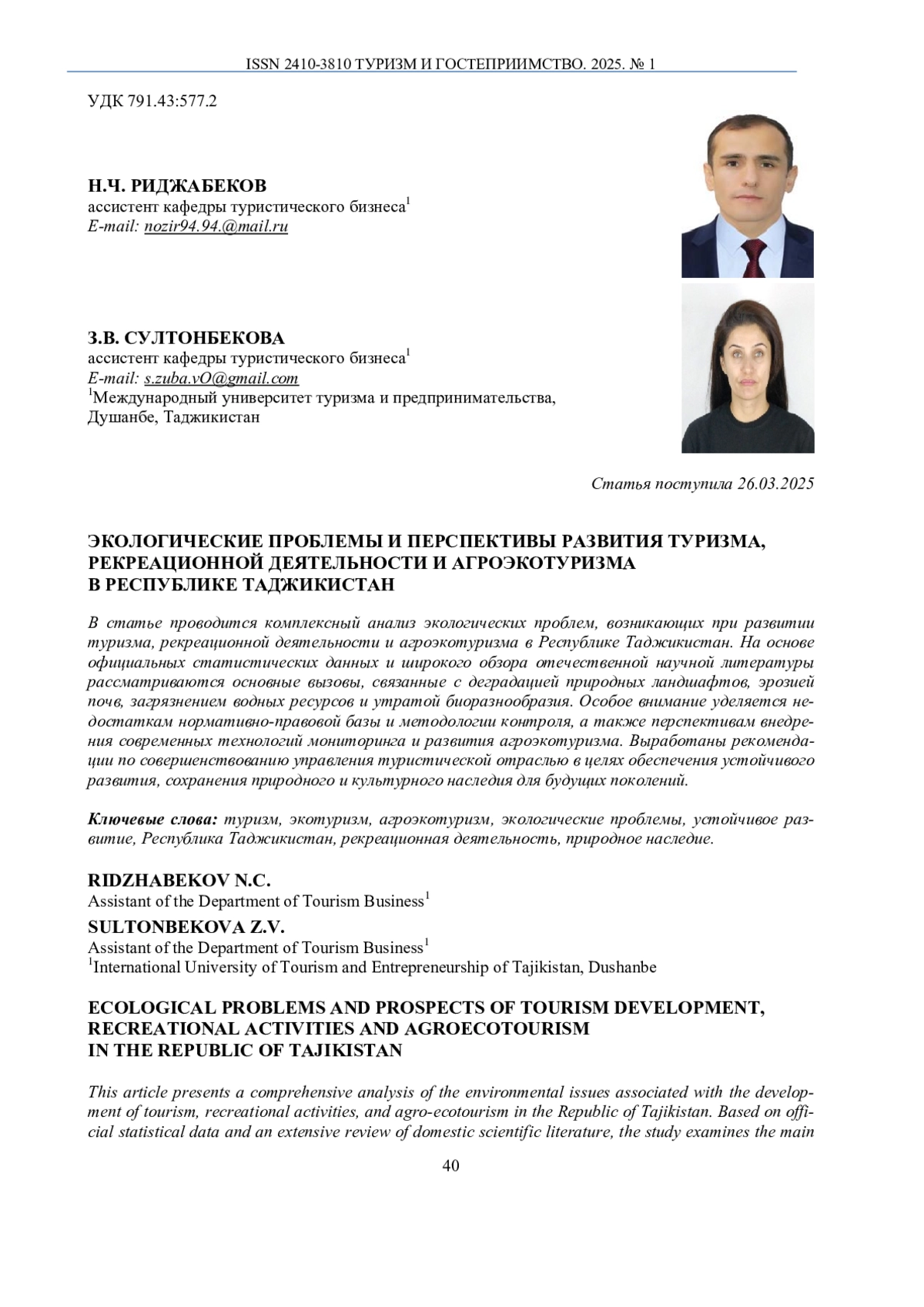 РИДЖАБЕКОВ Н.Ч., СУЛТОНБЕКОВА З.В. ЭКОЛОГИЧЕСКИЕ ПРОБЛЕМЫ И ПЕРСПЕКТИВЫ РАЗВИТИЯ ТУРИЗМА, РЕКРЕАЦИОННОЙ ДЕЯТЕЛЬНОСТИ И АГРОЭКОТУРИЗМА В РЕСПУБЛИКЕ ТАДЖИКИСТАН // ТУРИЗМ И ГОСТЕПРИИМСТВО. 2025. № 1