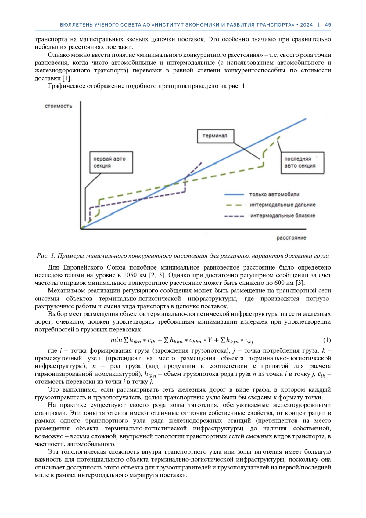 В статье рассматривается вопрос оценки целесообразности создания и выбора места размещения объектов терминально-логистической инфраструктуры в пределах транспортных узлов через стоимостную интерпретацию интегральной транспортной доступности.