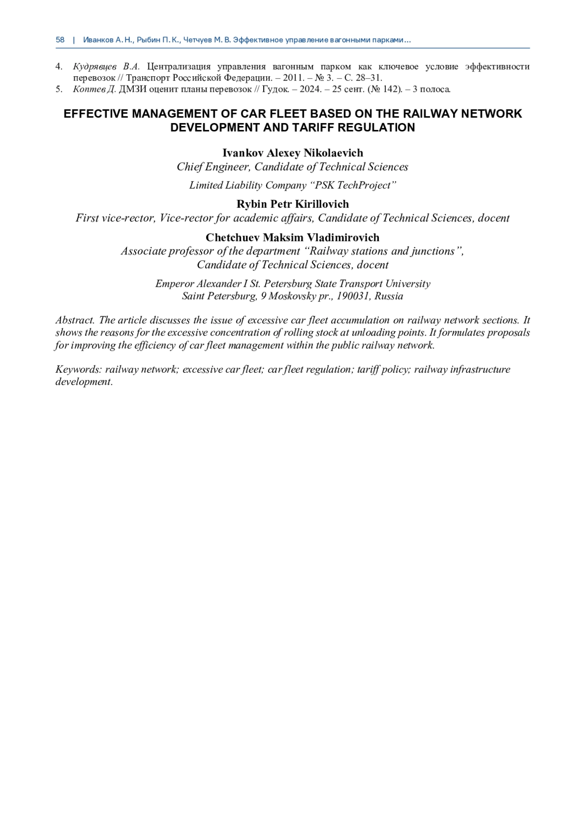 4. Кудрявцев В.А. Централизация управления вагонным парком как ключевое условие эффективности перевозок // Транспорт Российской Федерации. - 2011. - № 3. - С. 28-31.