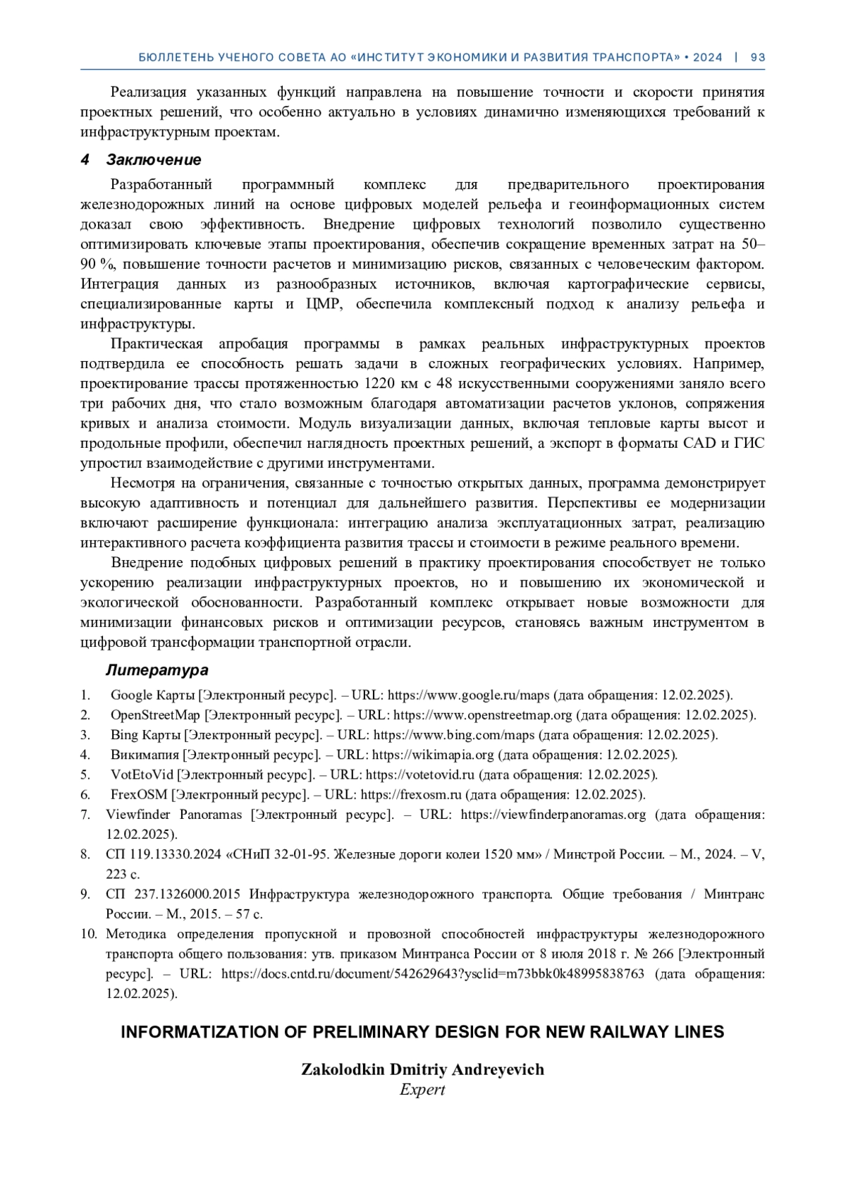 ЗАКОЛОДКИН Д. А. ИНФОРМАТИЗАЦИЯ ПРЕДВАРИТЕЛЬНОГО ПРОЕКТИРОВАНИЯ НОВЫХ ЖЕЛЕЗНОДОРОЖНЫХ ЛИНИЙ // БЮЛЛЕТЕНЬ УЧЕНОГО СОВЕТА АО "ИЭРТ". 2025. № 10-1