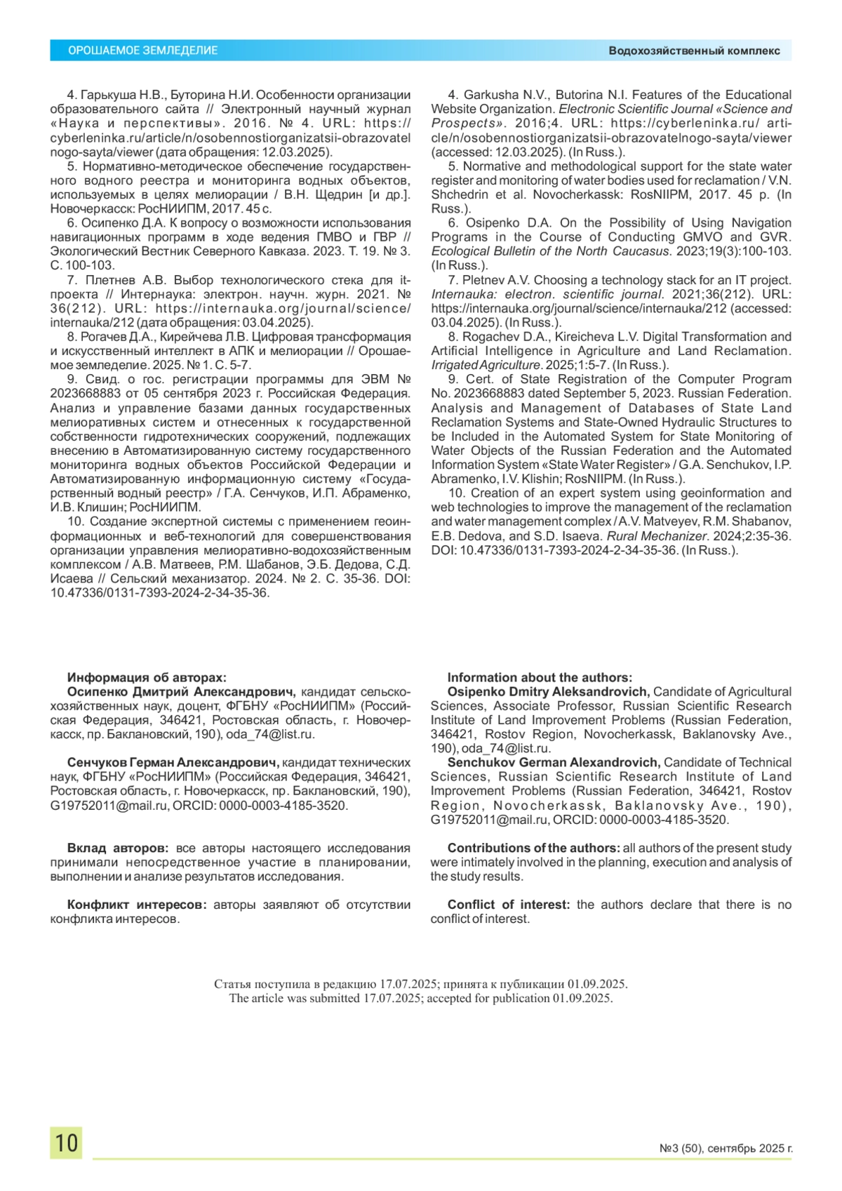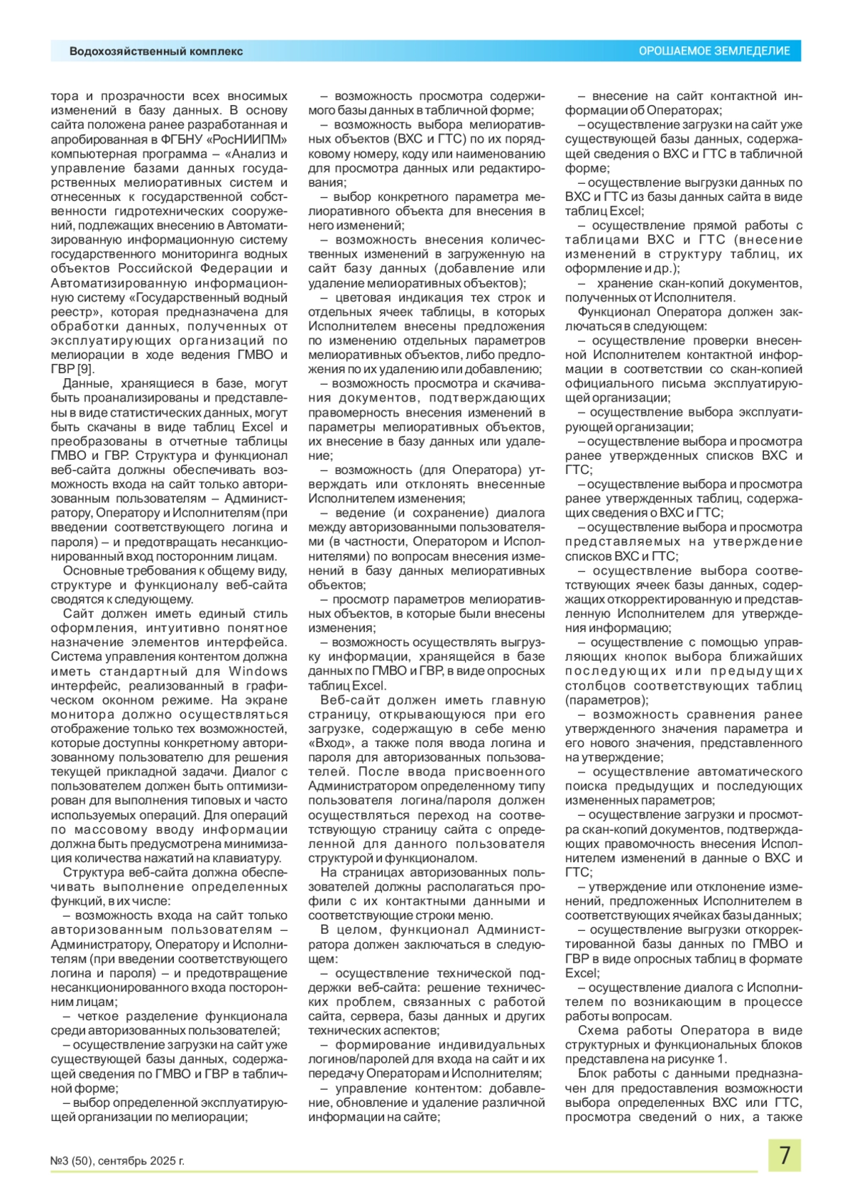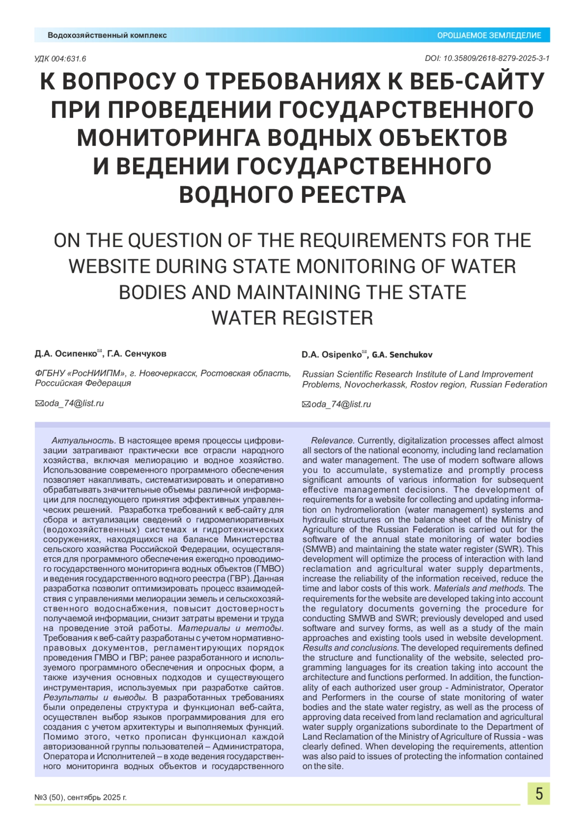 ОСИПЕНКО Д. А., СЕНЧУКОВ Г. А. К ВОПРОСУ О ТРЕБОВАНИЯХ К ВЕБ-САЙТУ ПРИ ПРОВЕДЕНИИ ГОСУДАРСТВЕННОГО МОНИТОРИНГА ВОДНЫХ ОБЪЕКТОВ И ВЕДЕНИИ ГОСУДАРСТВЕННОГО ВОДНОГО РЕЕСТРА // ОРОШАЕМОЕ ЗЕМЛЕДЕЛИЕ. 2025. № 3 (50)