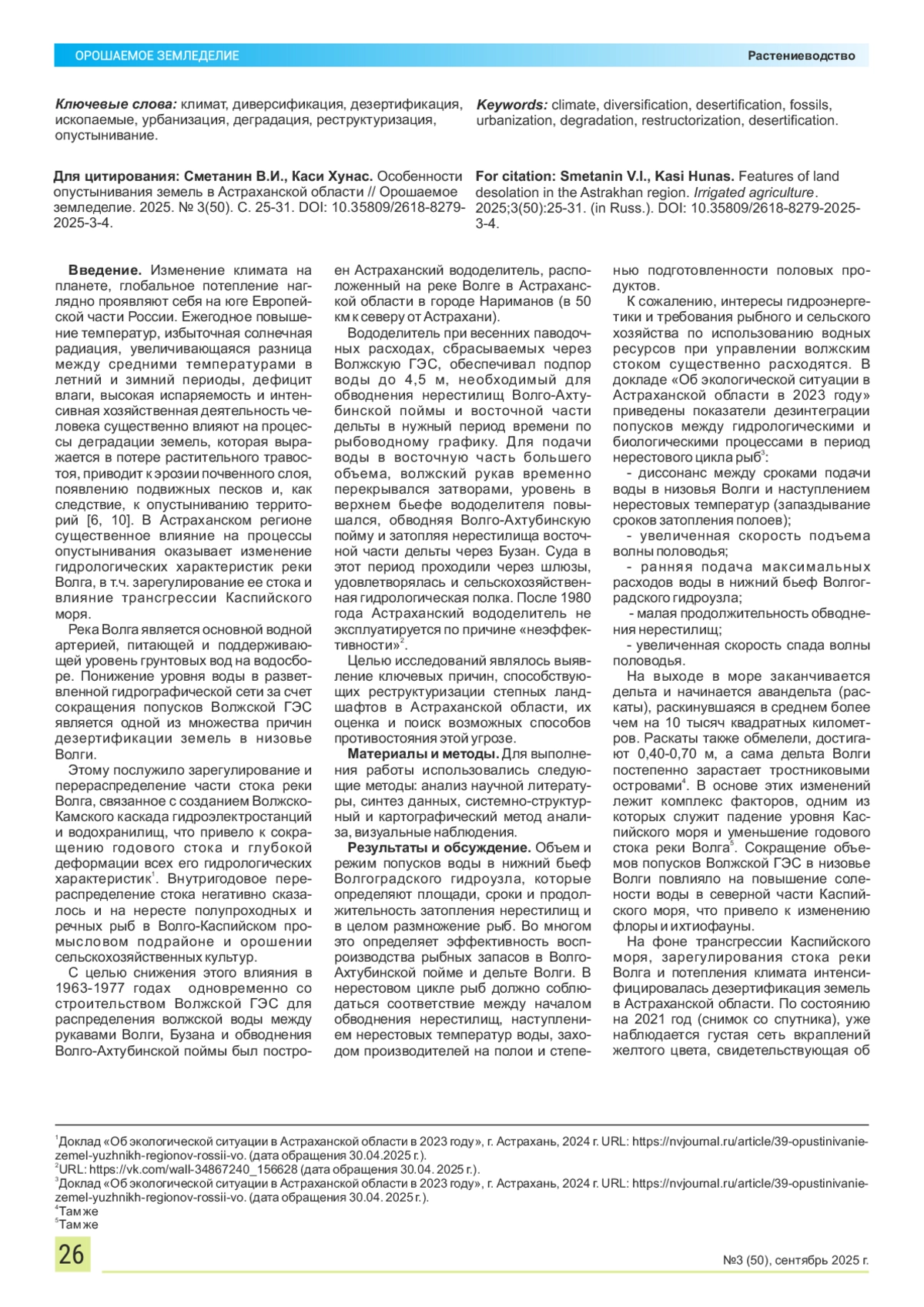 СМЕТАНИН В. И., ХУНАС К. ОСОБЕННОСТИ ОПУСТЫНИВАНИЯ ЗЕМЕЛЬ В АСТРАХАНСКОЙ ОБЛАСТИ // ОРОШАЕМОЕ ЗЕМЛЕДЕЛИЕ. 2025. № 3 (50)