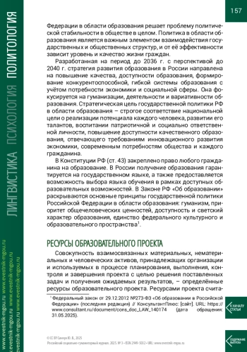 Цель. Проанализировать значимость эффективного управления ресурсами образовательных проектов в контексте основных принципов государственной политики России в области образования.