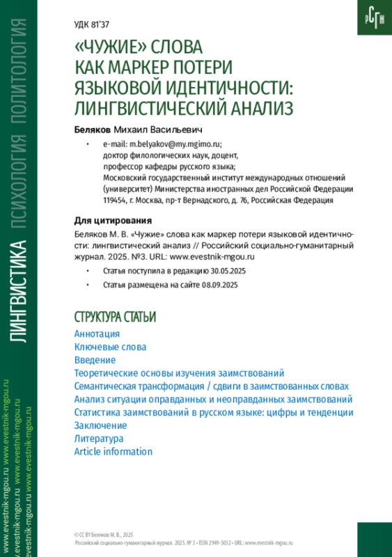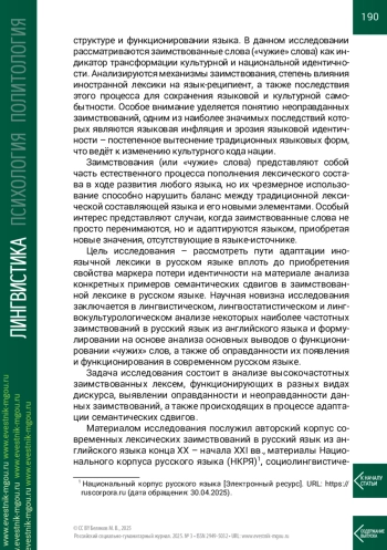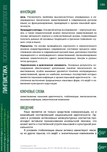Цель. Рассмотреть проблему высокочастотных оправданных и неоправданных лексических заимствований в современном русском языке, их функционирование, приводящее к эрозии языковой идентичности.