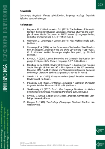 1. Беляков М. В., Максименко О. И. Проблема семантических сдвигов в современном русском языке: корпусное исследование на примере новостного медиадискурса // Вестник Российского университета дружбы народов. Серия: Теория языка. Семиотика. Семантика. 2023. №1. С. 174-194.