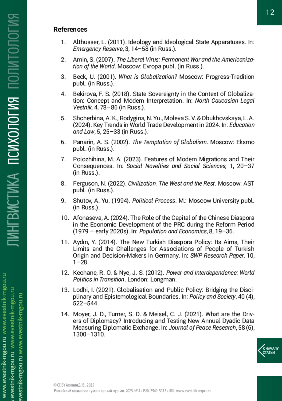 Результаты. Установлено, что на агентном уровне политического процесса влияние глобализации характеризуется через появление новых акторов, влияющих на внутриполитическую ситуацию. На конститутивном уровне политического процесса глобализация приводит к изменениям системы институтов, происходят процесс унификации институтов и обратный ему процесс фрагментации. На метаполитическом уровне процесс глобализации влияет на суверенитет политической системы при появлении новых надсистемных игроков на мировой арене.