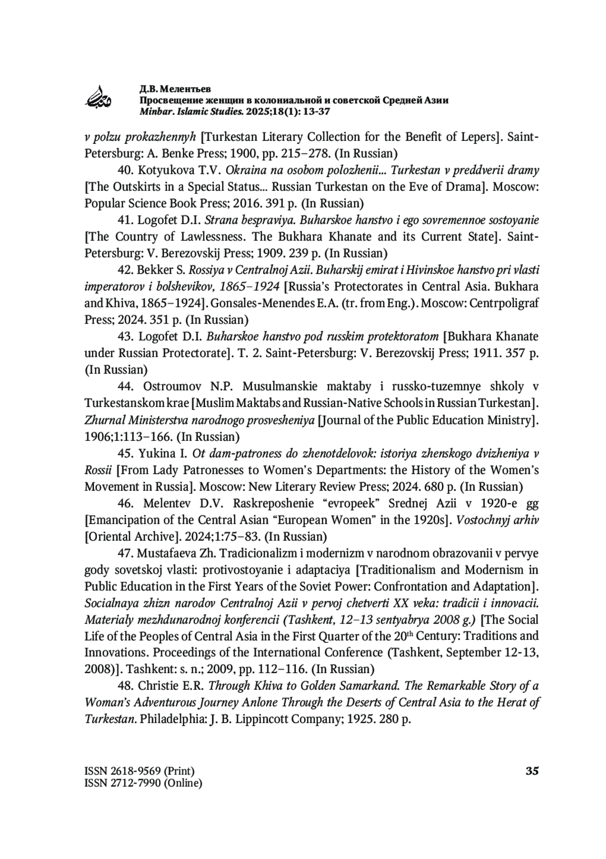 50. Мелентьев Д.В. Роль Главного Вакуфного Управления в советизации мусульманского образования и становлении советской сети школ в Туркестане. Islamology. 2018;1:57-77.