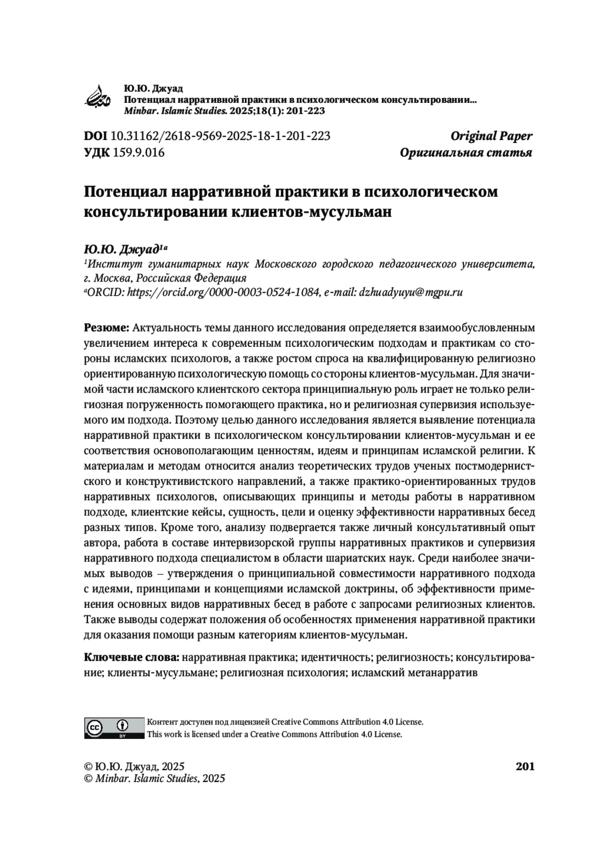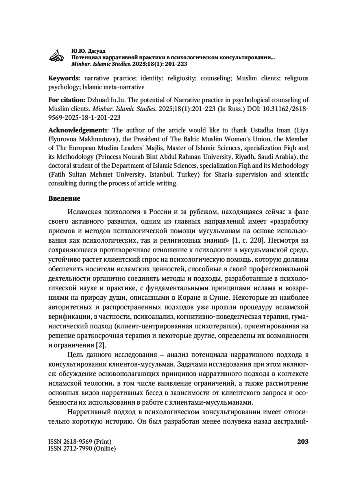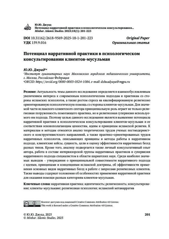 Актуальность темы данного исследования определяется взаимообусловленным увеличением интереса к современным психологическим подходам и практикам со стороны исламских психологов, а также ростом спроса на квалифицированную религиозно ориентированную психологическую помощь со стороны клиентов-мусульман. Для значимой части исламского клиентского сектора принципиальную роль играет не только религиозная погруженность помогающего практика, но и религиозная супервизия используемого им подхода. Поэтому целью данного исследования является выявление потенциала нарративной практики в психологическом консультировании клиентов-мусульман и ее соответствия основополагающим ценностям, идеям и принципам исламской религии. К материалам и методам относится анализ теоретических трудов ученых постмодернистского и конструктивистского направлений, а также практико-ориентированных трудов нарративных психологов, описывающих принципы и методы работы в нарративном подходе, клиентские кейсы, сущность, цели и оценку эффективности нарративных бесед разных типов. Кроме того, анализу подвергается также личный консультативный опыт автора, работа в составе интервизорской группы нарративных практиков и супервизия нарративного подхода специалистом в области шариатских наук. Среди наиболее значимых выводов – утверждения о принципиальной совместимости нарративного подхода с идеями, принципами и концепциями исламской доктрины, об эффективности применения основных видов нарративных бесед в работе с запросами религиозных клиентов. Также выводы содержат положения об особенностях применения нарративной практики для оказания помощи разным категориям клиентов-мусульман.