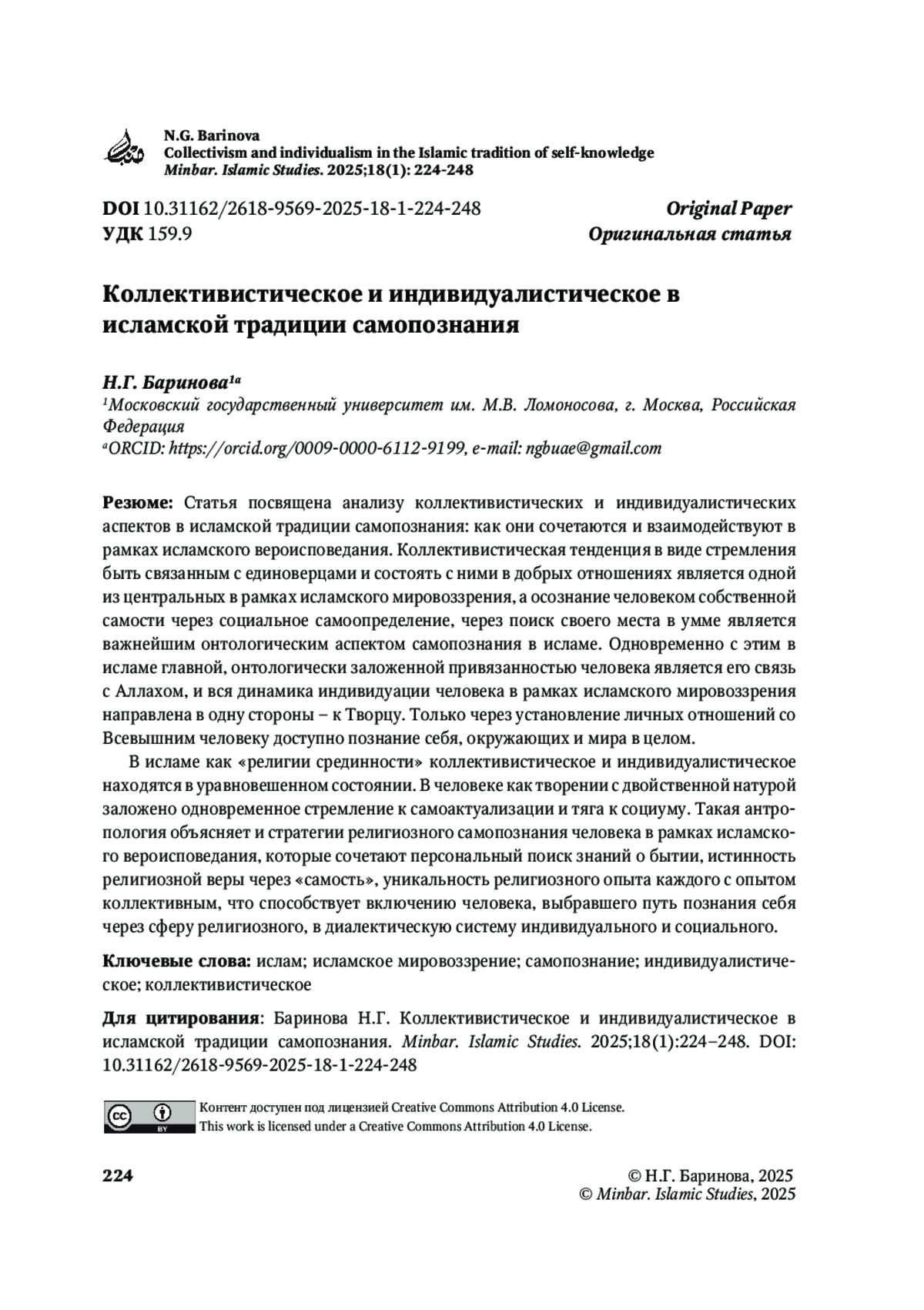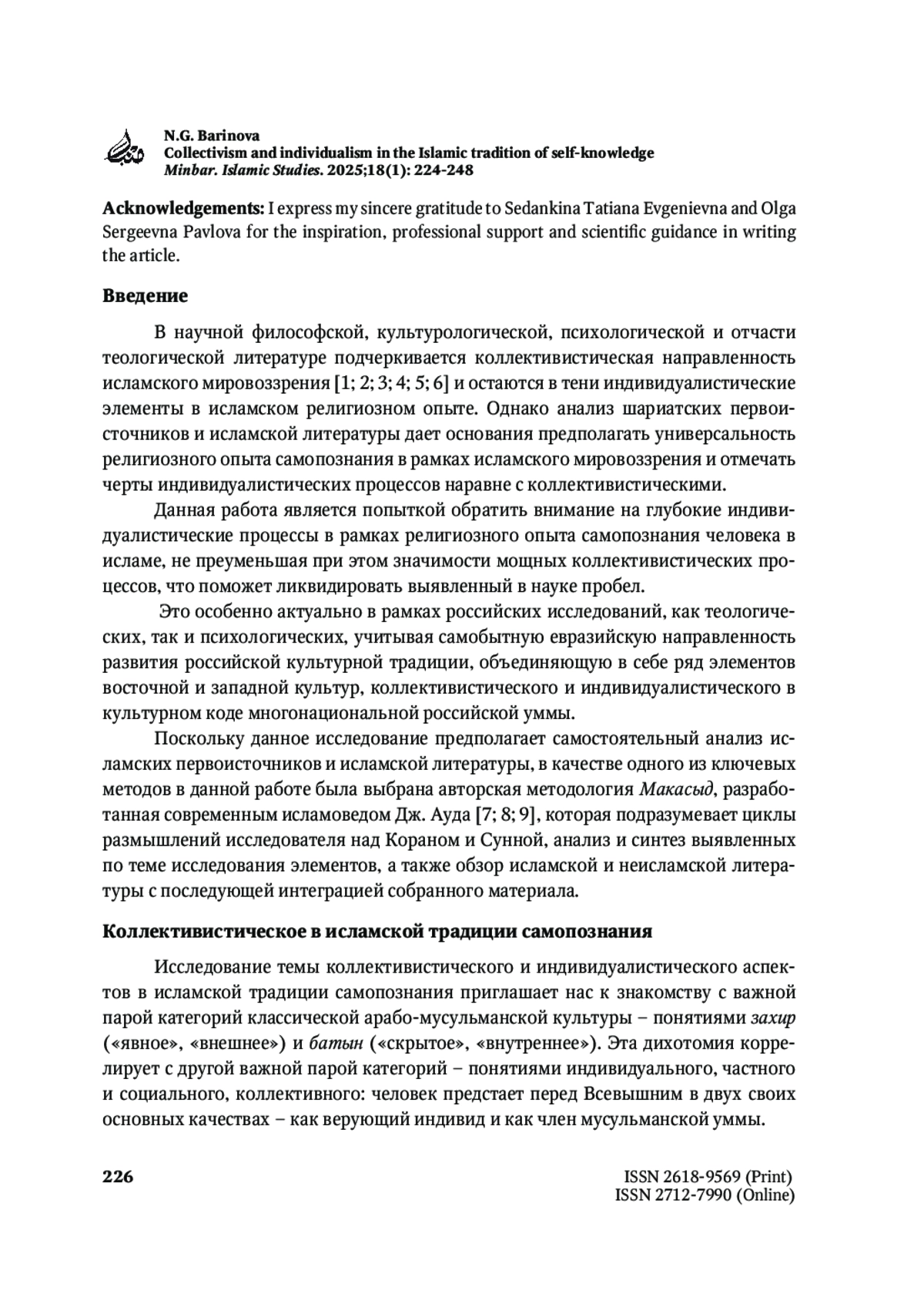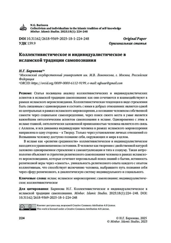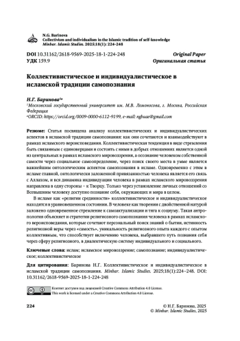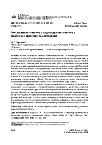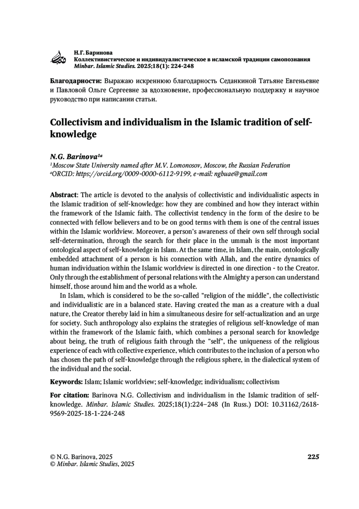 БАРИНОВА Н. Г. КОЛЛЕКТИВИСТИЧЕСКОЕ И ИНДИВИДУАЛИСТИЧЕСКОЕ В ИСЛАМСКОЙ ТРАДИЦИИ САМОПОЗНАНИЯ // MINBAR. ISLAMIC STUDIES. 2025. № 1, ТОМ 18