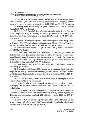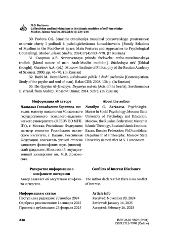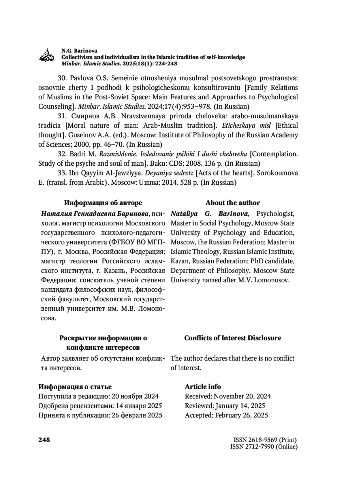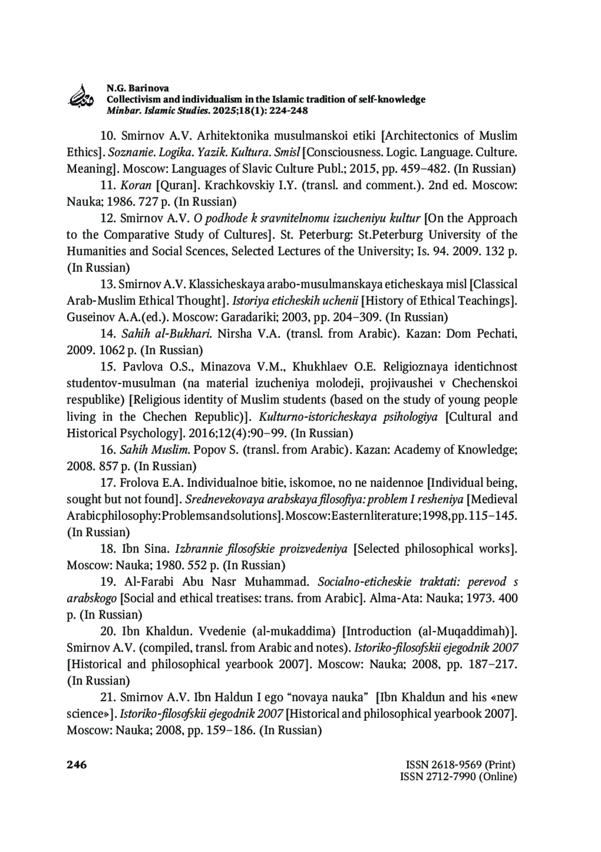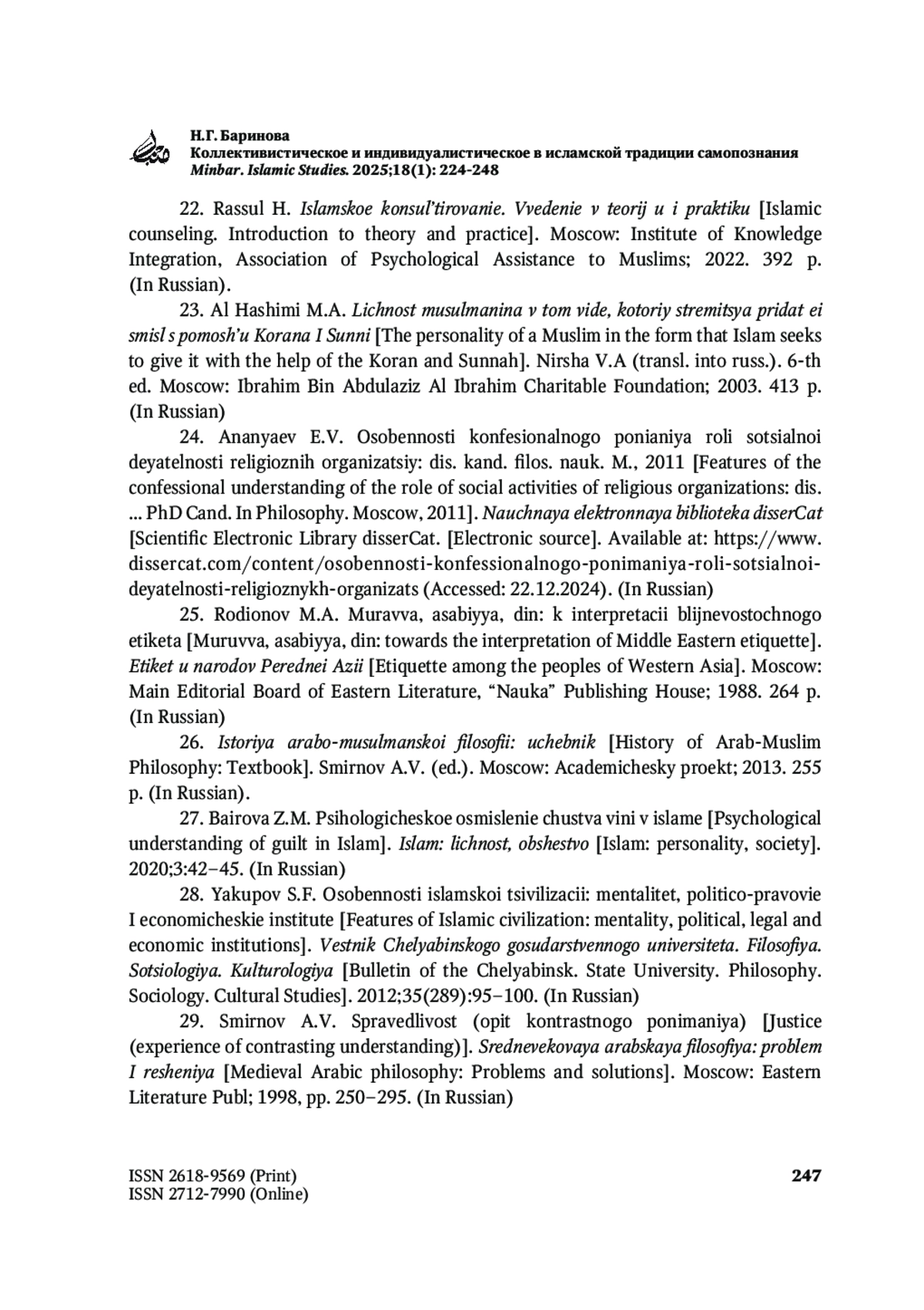 БАРИНОВА Н. Г. КОЛЛЕКТИВИСТИЧЕСКОЕ И ИНДИВИДУАЛИСТИЧЕСКОЕ В ИСЛАМСКОЙ ТРАДИЦИИ САМОПОЗНАНИЯ // MINBAR. ISLAMIC STUDIES. 2025. № 1, ТОМ 18