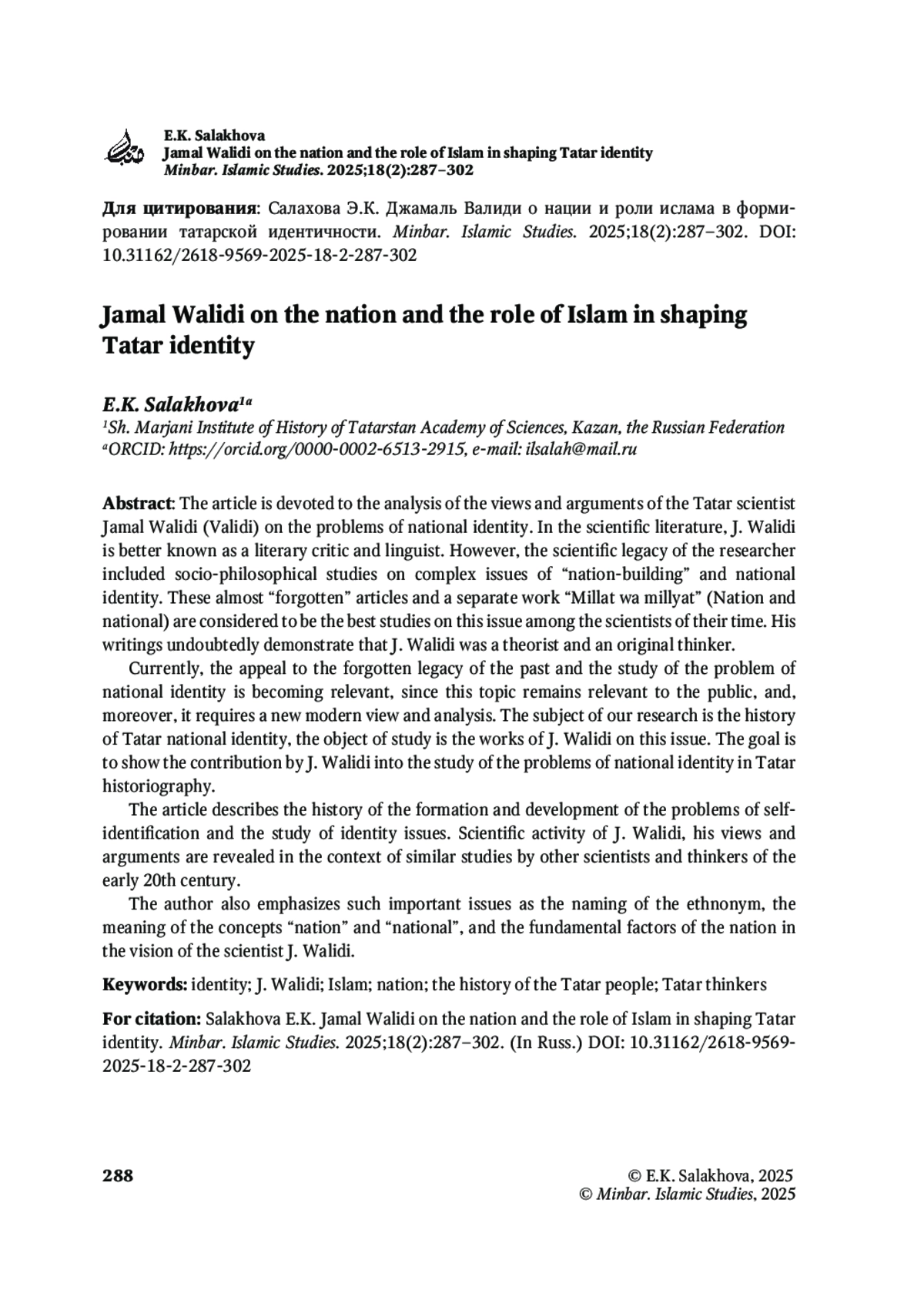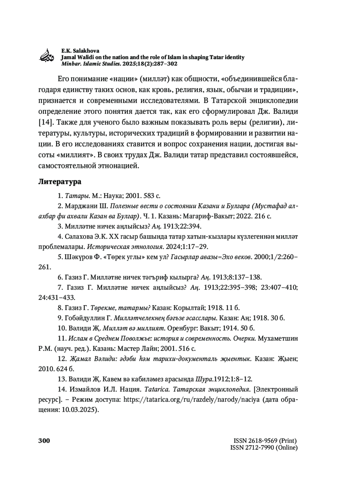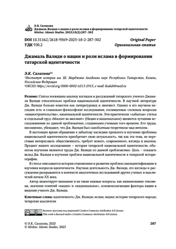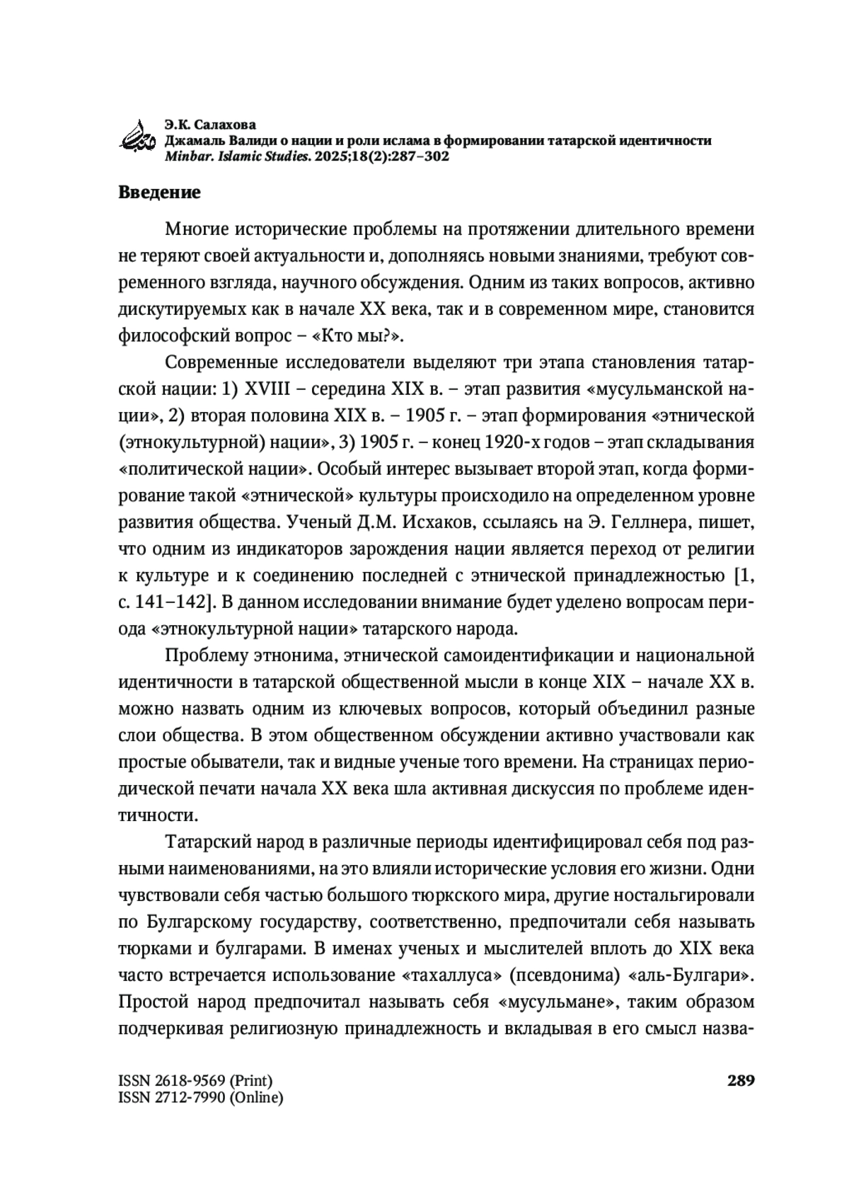 САЛАХОВА Э. К. ДЖАМАЛЬ ВАЛИДИ О НАЦИИ И РОЛИ ИСЛАМА В ФОРМИРОВАНИИ ТАТАРСКОЙ ИДЕНТИЧНОСТИ // MINBAR. ISLAMIC STUDIES. 2025. № 2, ТОМ 18