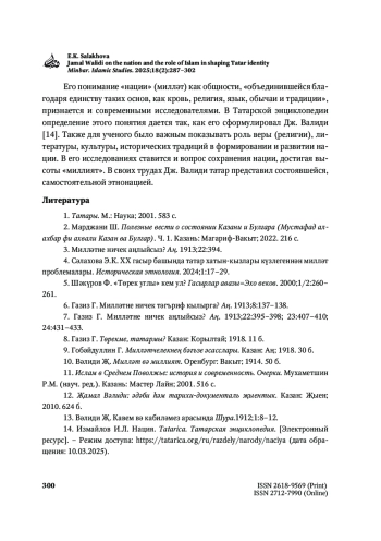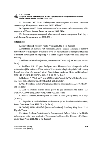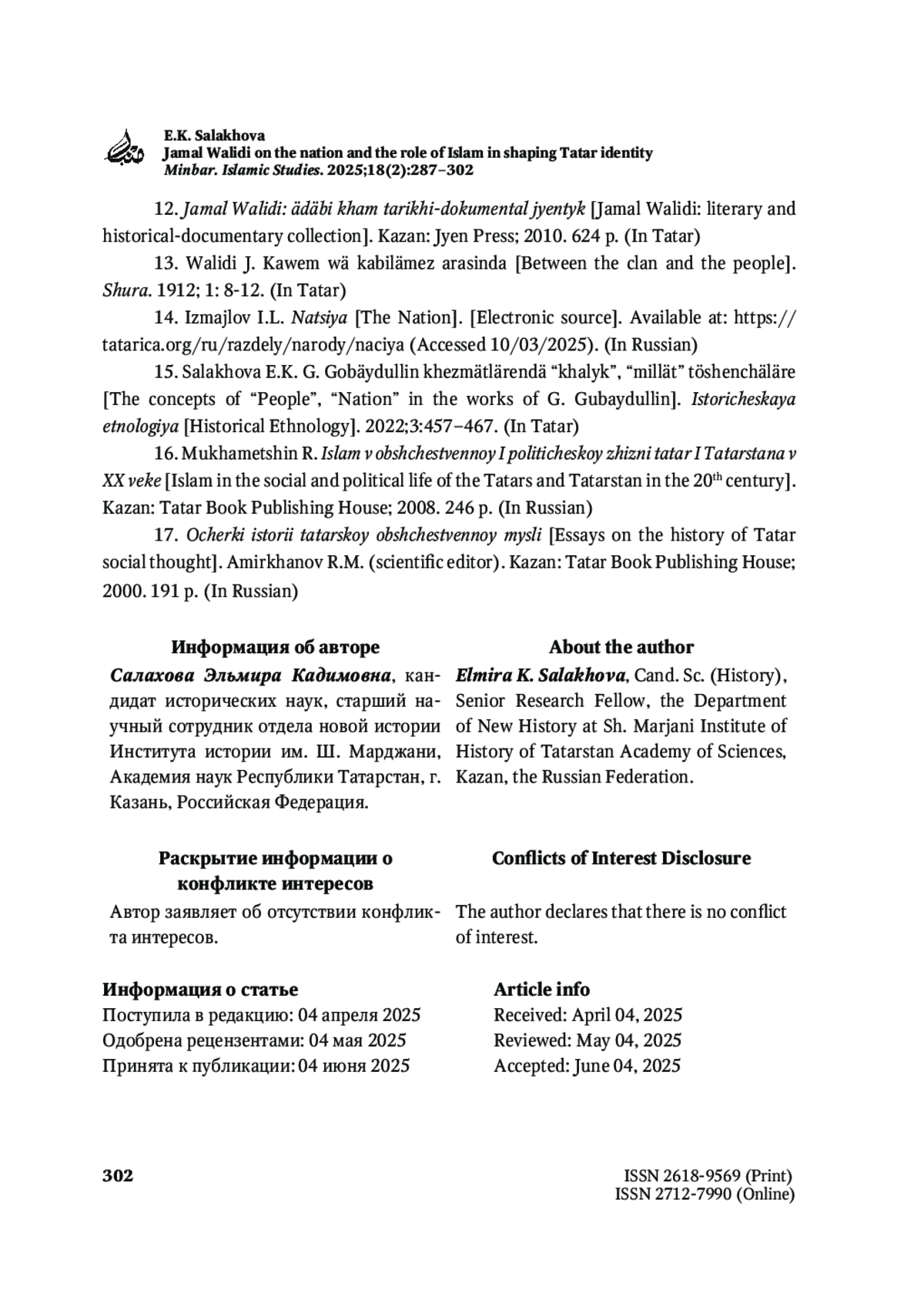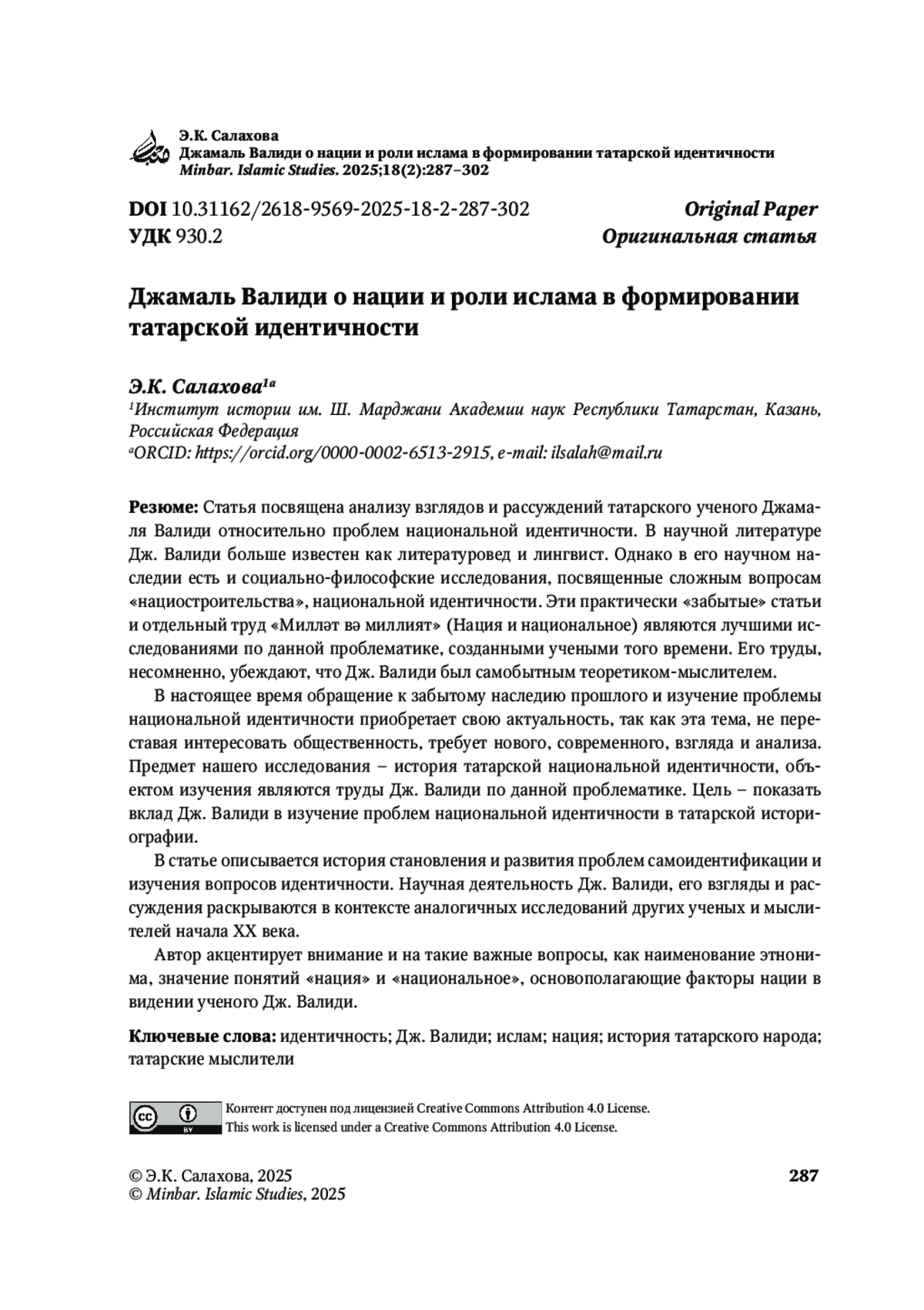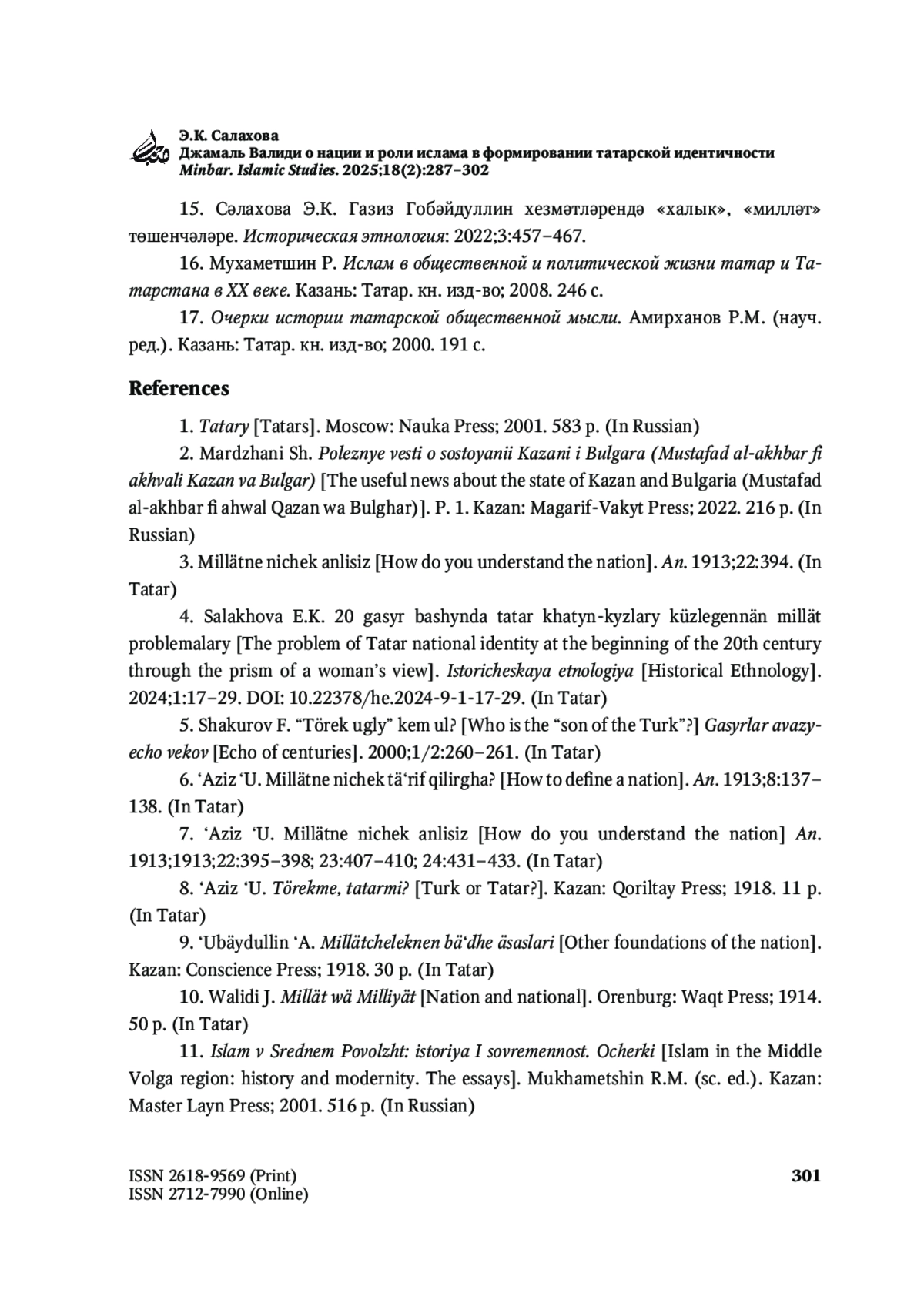 САЛАХОВА Э. К. ДЖАМАЛЬ ВАЛИДИ О НАЦИИ И РОЛИ ИСЛАМА В ФОРМИРОВАНИИ ТАТАРСКОЙ ИДЕНТИЧНОСТИ // MINBAR. ISLAMIC STUDIES. 2025. № 2, ТОМ 18