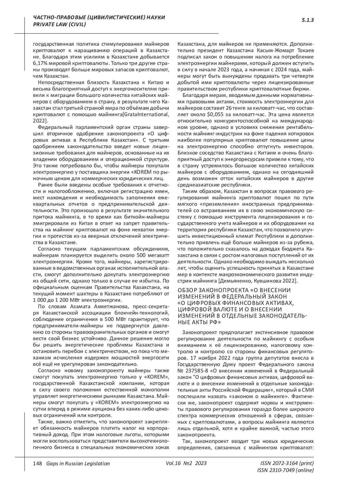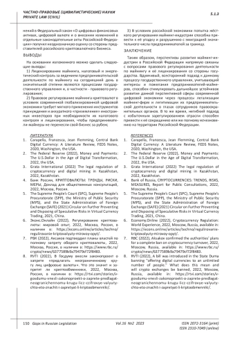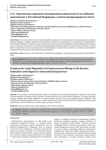 Статья: ПЕРСПЕКТИВЫ ПРАВОВОГО РЕГУЛИРОВАНИЯ ДЕЯТЕЛЬНОСТИ ПО МАЙНИНГУ КРИПТОВАЛЮТ В РОССИЙСКОЙ ФЕДЕРАЦИИ С УЧЕТОМ МЕЖДУНАРОДНОГО ОПЫТА (2023)