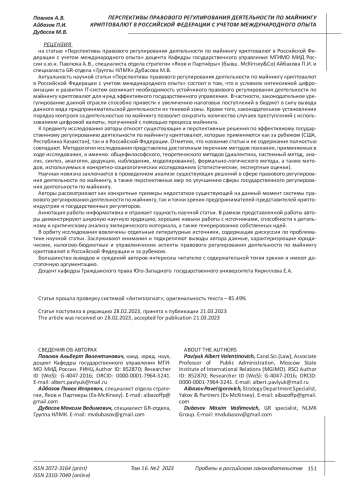Ключевые фразы: МАЙНИНГ, криптовалюта, правовое регулирование, законопроект, российское законодательство