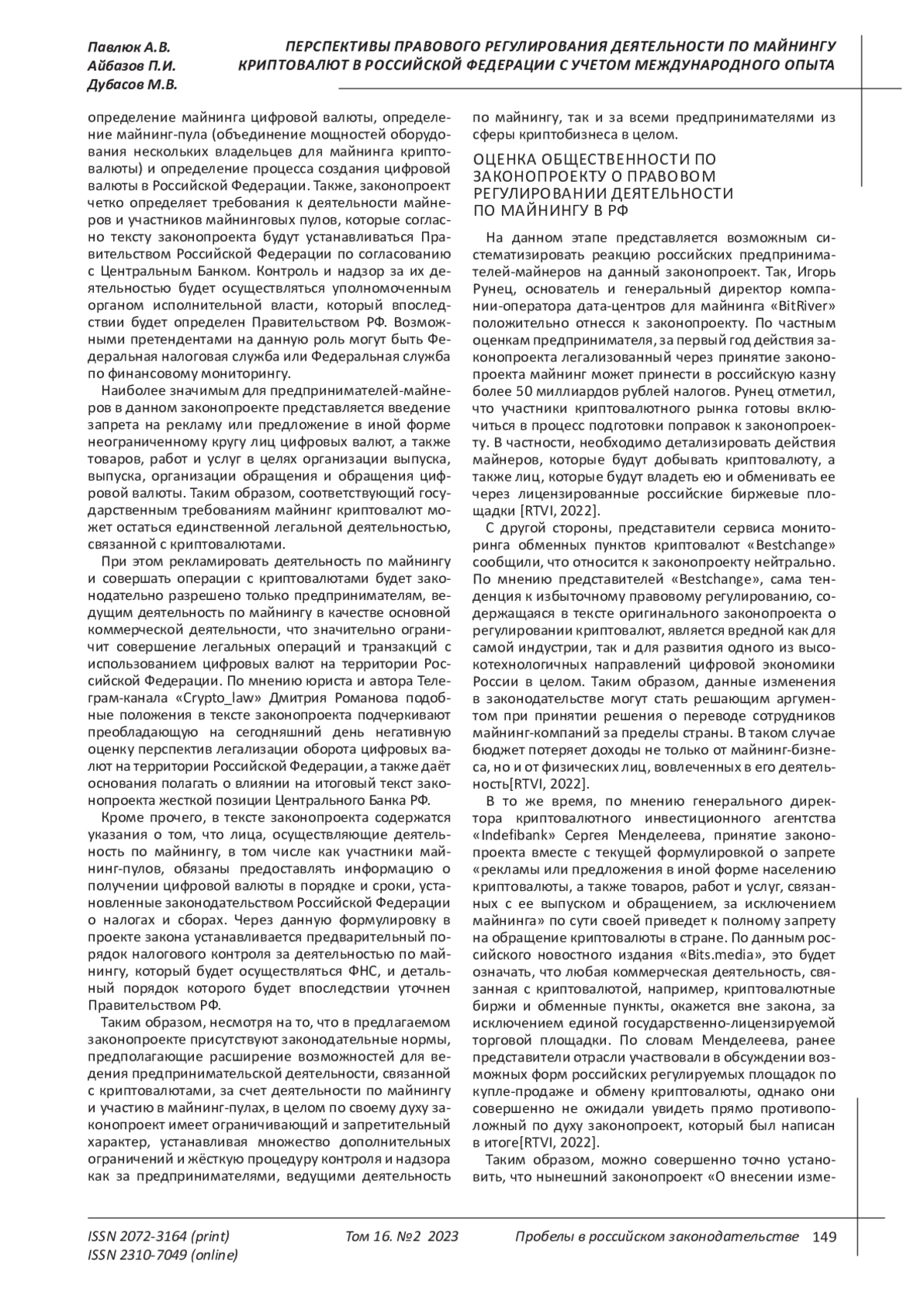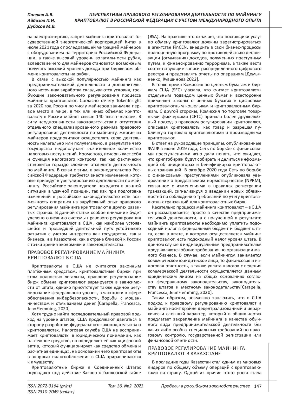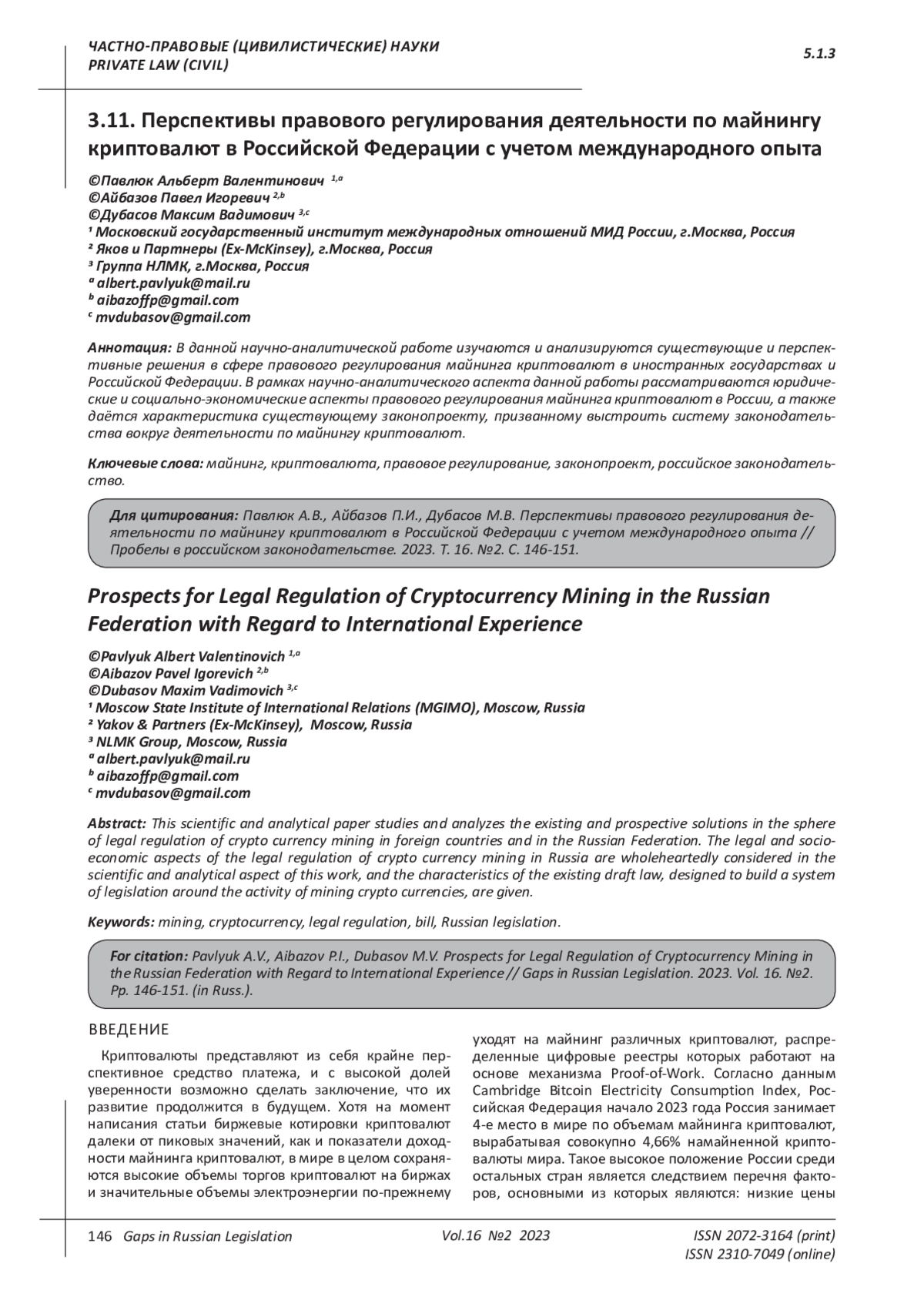 ПАВЛЮК А. В., АЙБАЗОВ П. И., ДУБАСОВ М. В. ПЕРСПЕКТИВЫ ПРАВОВОГО РЕГУЛИРОВАНИЯ ДЕЯТЕЛЬНОСТИ ПО МАЙНИНГУ КРИПТОВАЛЮТ В РОССИЙСКОЙ ФЕДЕРАЦИИ С УЧЕТОМ МЕЖДУНАРОДНОГО ОПЫТА // ПРОБЕЛЫ В РОССИЙСКОМ ЗАКОНОДАТЕЛЬСТВЕ. 2023. Т. 16 № 2