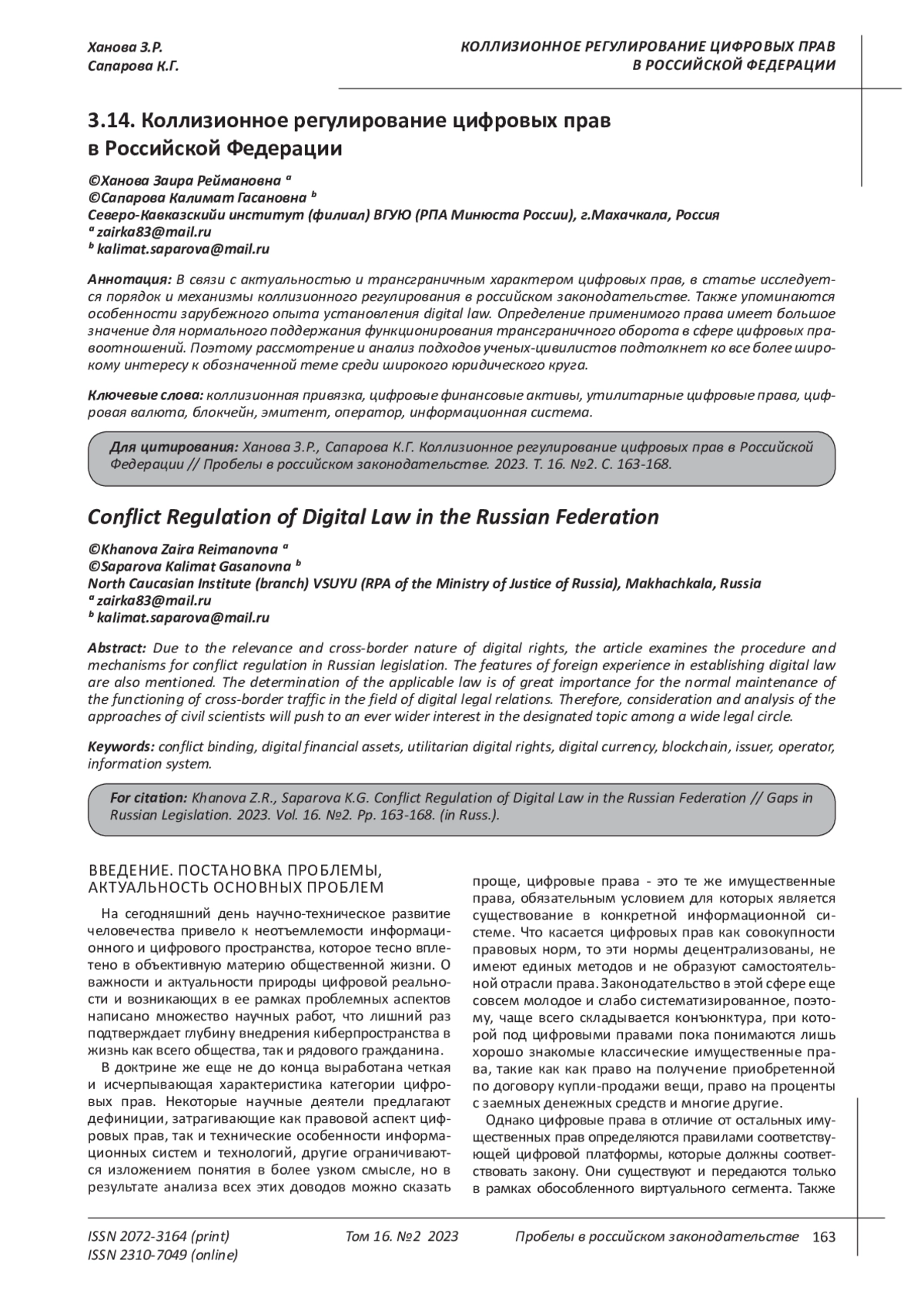 Kuzmenkov M. Yu. Conflict regulation of utilitarian digital rights // Actual problems of Russian law. 2022. V. 17. No. 4. P. 125-135. EDN: BMBBMP