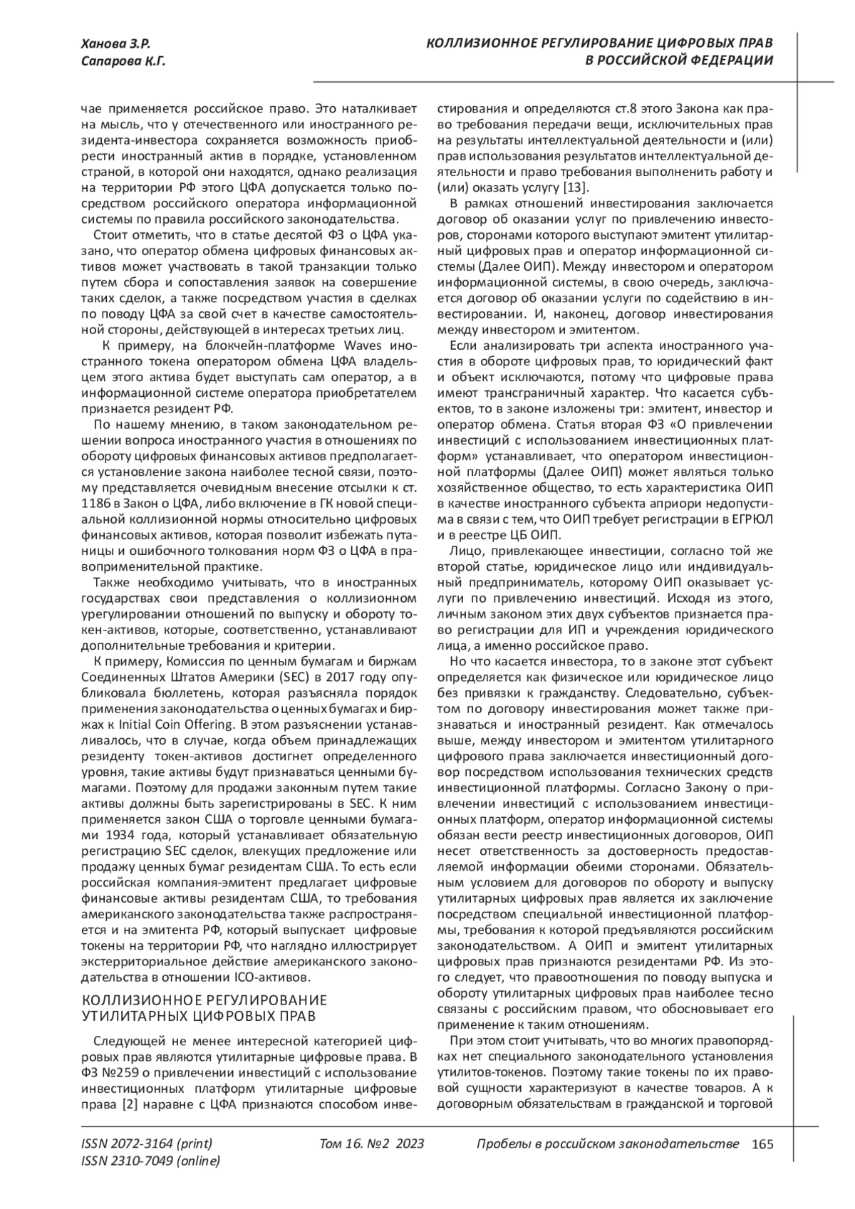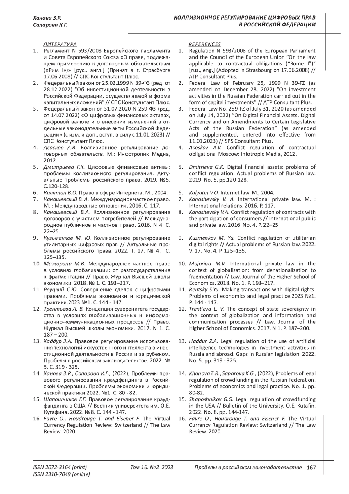 9. Кузьменков М. Ю. Коллизионное регулирование утилитарных цифровых прав // Актуальные проблемы российского права. 2022. Т. 17. № 4. С. 125-135. EDN: BMBBMP