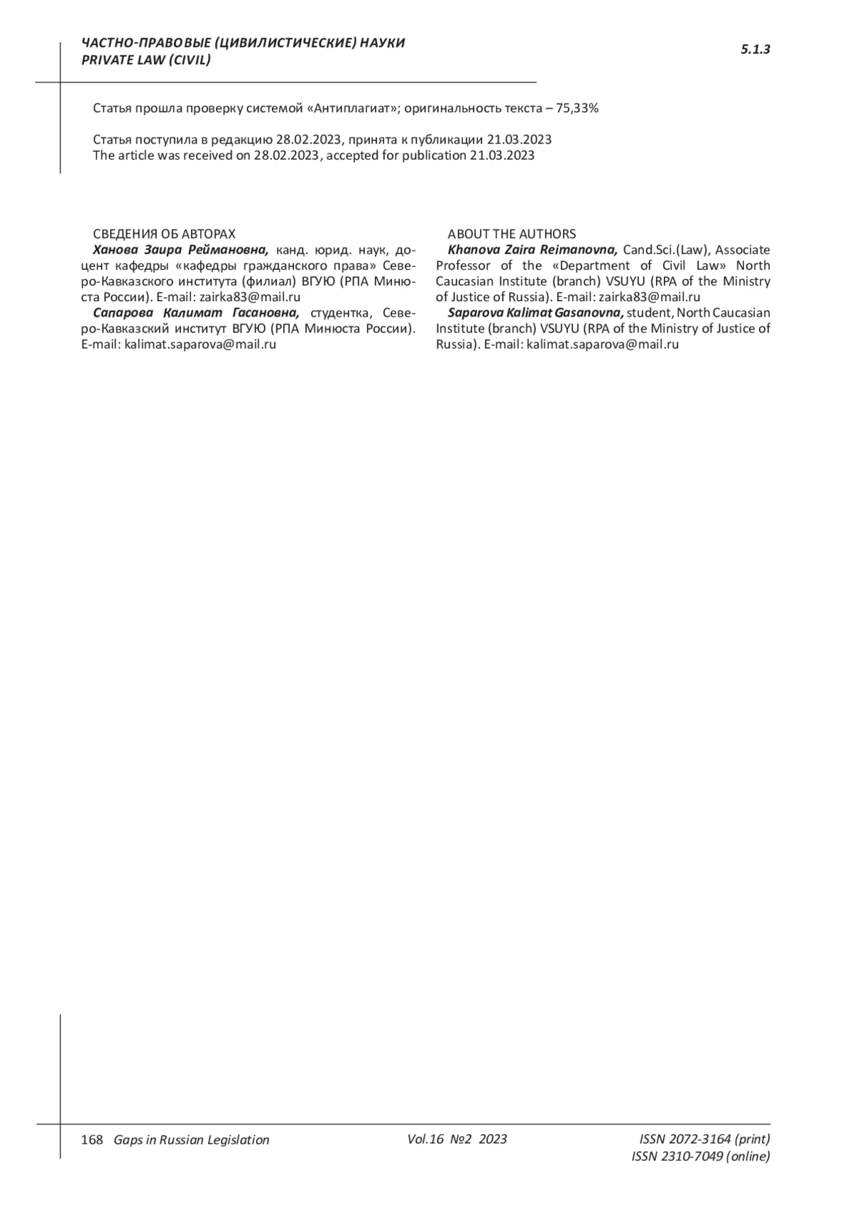 Khanova Z.R., Saparova K.G., (2022), Problems of legal regulation of crowdfunding in the Russian Federation. Problems of economics and legal practice. No. 1. pp. 80-82. EDN: WBAWUU