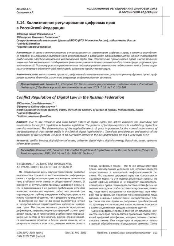 В связи с актуальностью и трансграничным характером цифровых прав, в статье исследуется порядок и механизмы коллизионного регулирования в российском законодательстве. Также упоминаются особенности зарубежного опыта установления digital law. Определение применимого права имеет большое значение для нормального поддержания функционирования трансграничного оборота в сфере цифровых правоотношений. Поэтому рассмотрение и анализ подходов ученых-цивилистов подтолкнет ко все более широкому интересу к обозначенной теме среди широкого юридического круга.
