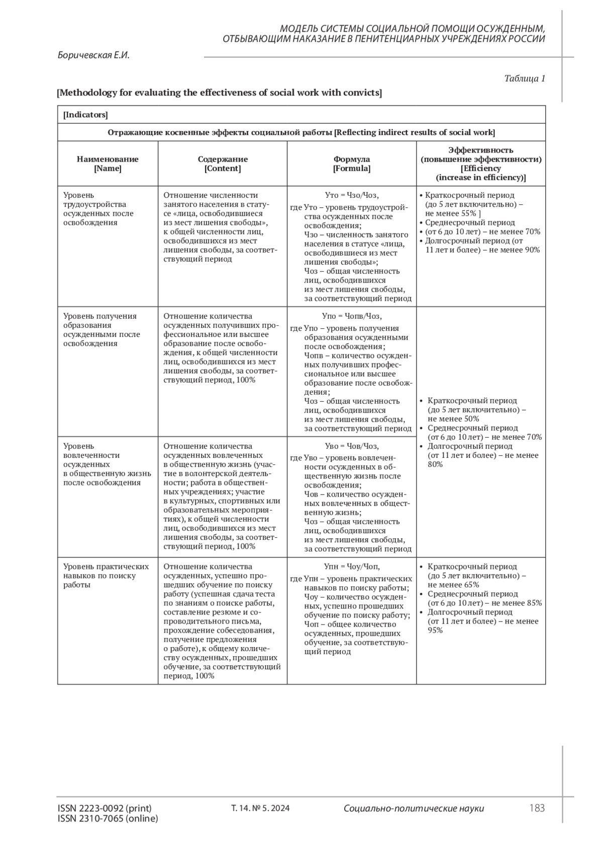 Цель исследования. В статье рассматриваются показатели, отражающие прямые и косвенные результаты социальной работы с осужденными. Вместе с тем, в работе отмечается, что несмотря на нормативно-правовую базу, в которой указаны мероприятия по работе с данной категорией индивидов, в настоящее время в законодательстве отсутствуют конкретные показатели эффективности социальной работы с осужденными. Отсутствие четких и измеримых показателей эффективности такой работы порождает ряд проблем. Как показывают различные социологические исследования и ведомственная статистика, на сегодняшний день доля повторных преступлений составляет 68%. Такой процент указывает на то, что общество до сих пор сталкивается с серьезной проблемой рецидива, тем самым подчеркивая не эффективность сложившейся социальной работы с осужденными. Выводы. На основе проведенного исследования выявлены показатели, определяющие эффективность социальной работы с осужденными. Автор делает вывод, что специфика российской пенитенциарной системы требует трансформации и предлагает авторскую методику оценки эффективности социальной работы с осужденными, которая учитывает как прямые результаты проводимых мер, так и косвенные эффекты ресоциализации. Важно отметить, что оценка такой работы должна быть комплексной и учитывать различные показатели, поскольку важно получить достоверную информацию о результативности проводимых мер и внести необходимые коррективы в работу социальных служб.