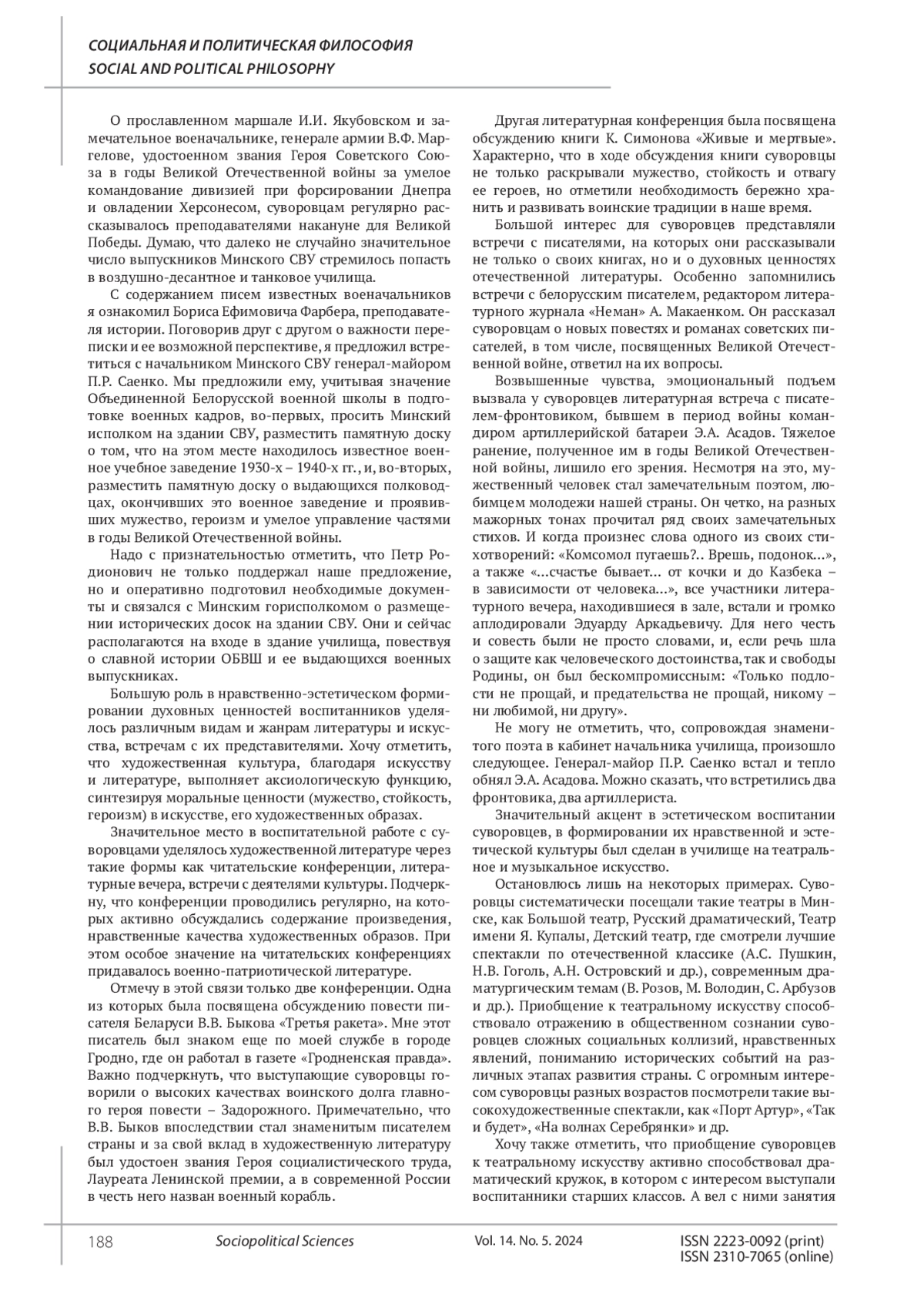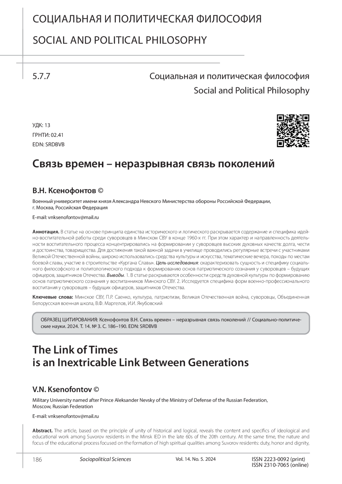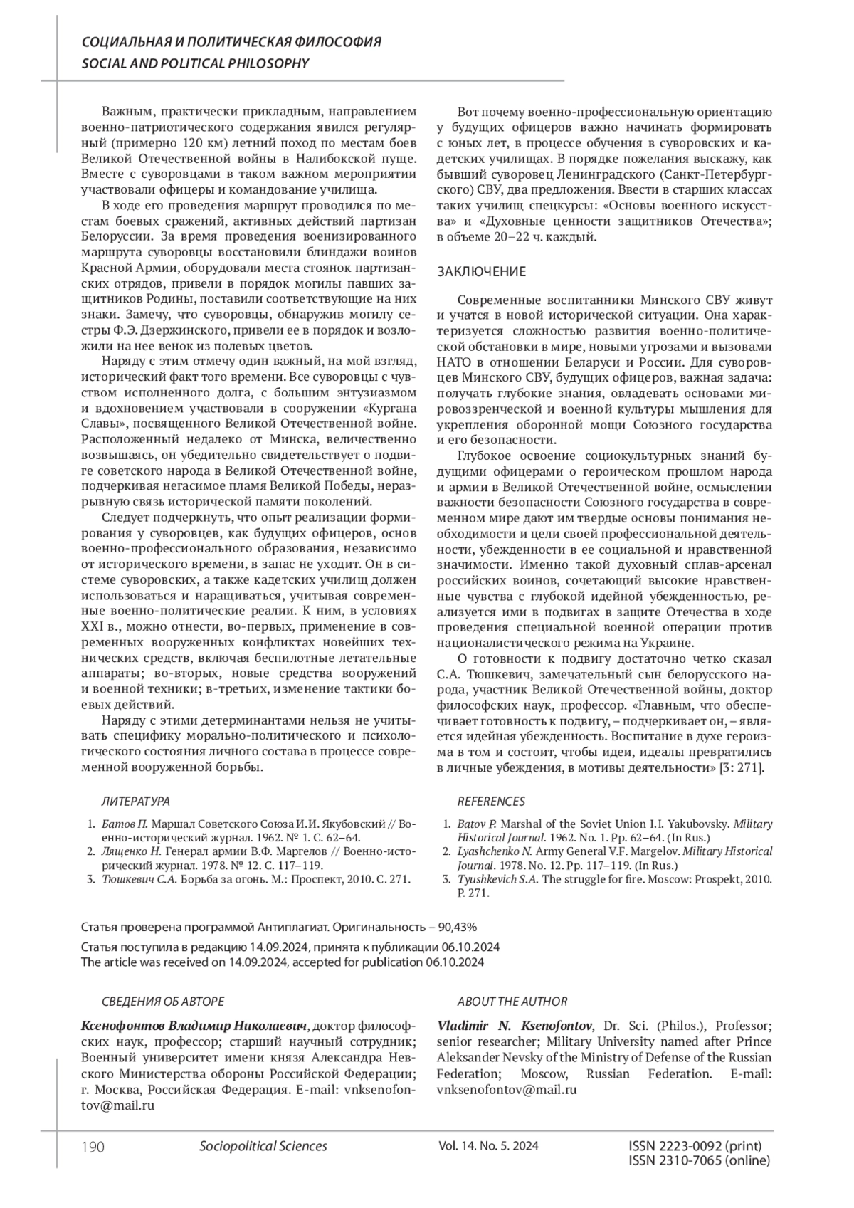 В статье на основе принципа единства исторического и логического раскрывается содержание и специфика идейно-воспитательной работы среди суворовцев в Минском СВУ в конце 1960-х гг. При этом характер и направленность деятельности воспитательного процесса концентрировались на формировании у суворовцев высоких духовных качеств: долга, чести и достоинства, товарищества. Для достижения такой важной задачи в училище проводились регулярные встречи с участниками Великой Отечественной войны, широко использовались средства культуры и искусства, тематические вечера, походы по местам боевой славы, участие в строительстве «Кургана Славы». Цель исследования: охарактеризовать сущность и специфику социального философского и политологического подхода к формированию основ патриотического сознания у суворовцев - будущих офицеров, защитников Отечества. Выводы. 1. В статье раскрываются особенности средств духовной культуры по формированию основ патриотического сознания у воспитанников Минского СВУ. 2. Исследуется специфика форм военно-профессионального воспитания у суворовцев - будущих офицеров, защитников Отечества.