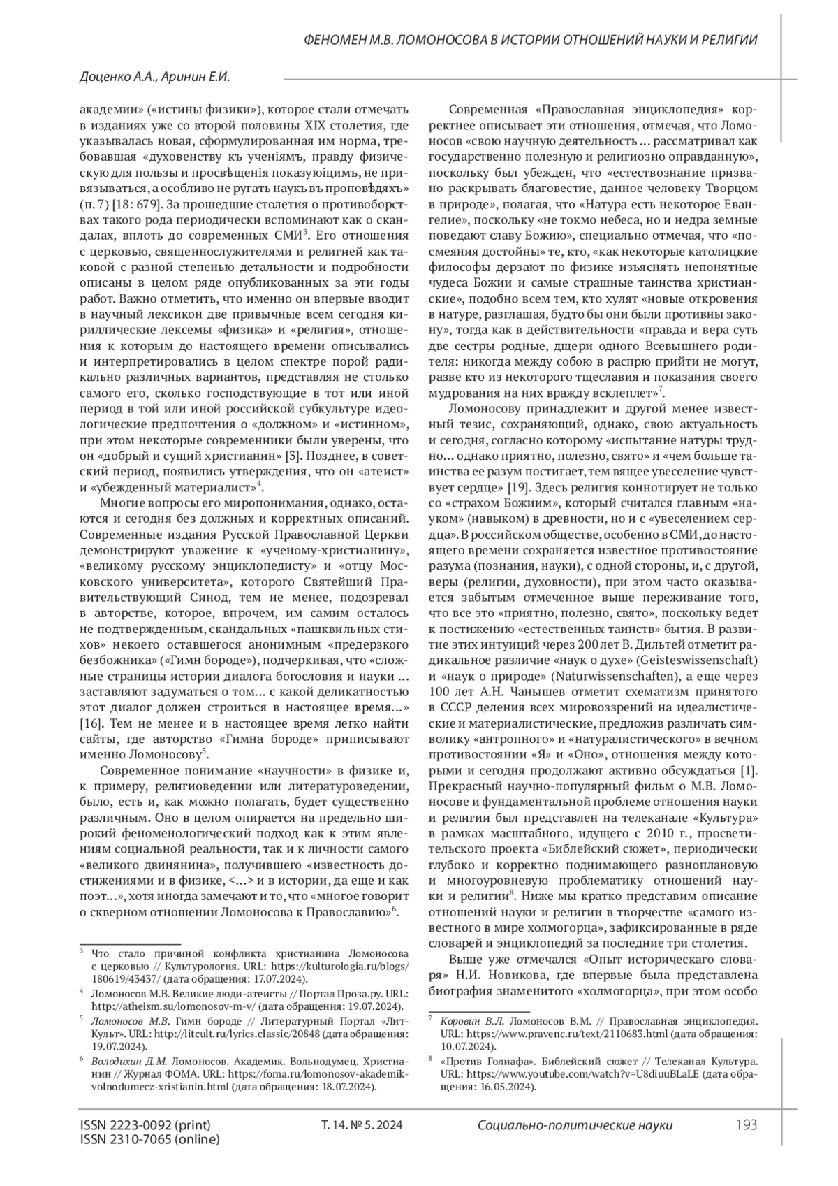 3. Аринин Е.И. Религия и М.В. Ломоносов // Михаил Ломоносов. Поморская энциклопедия. Архангельск: САФУ, 2022. С. 429.