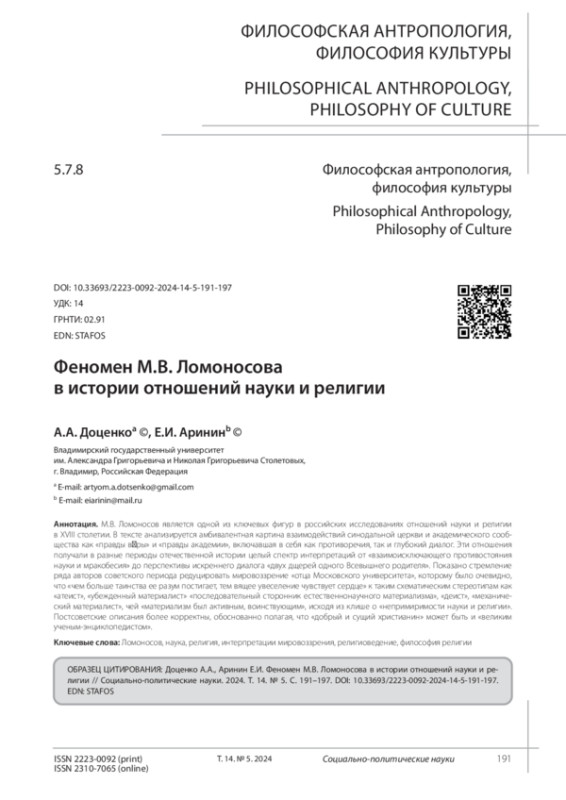 Arinin E.I. Orthodoxy and science (based on the work of M.V. Lomonosov). In: State. Society. Church: Proceedings of the international scientific conference (Vladimir, November 18, 2020). Vladimir: Arkaim, 2020. Pp. 105-119.