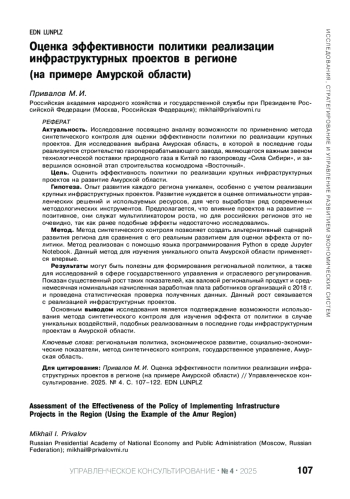 Статья: Оценка эффективности политики реализации инфраструктурных проектов в регионе (на примере Амурской области) (2025)