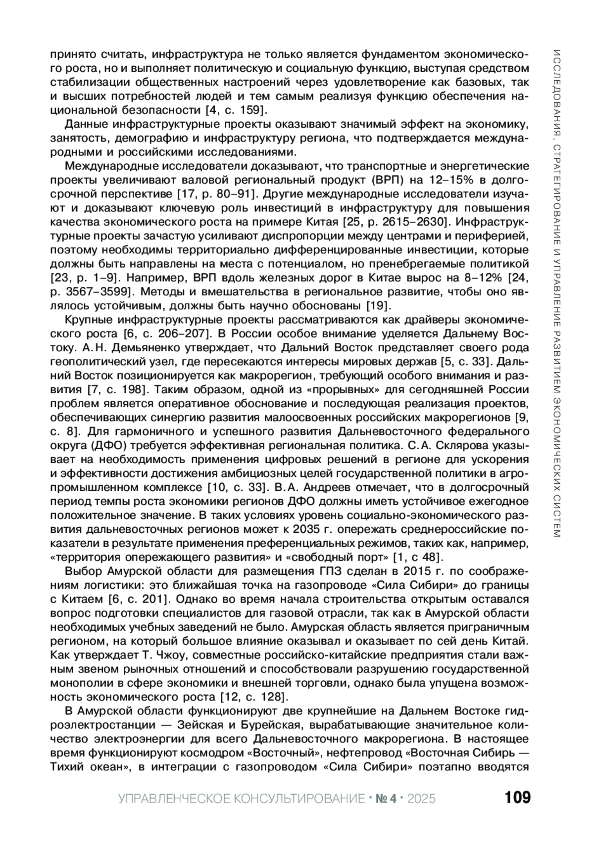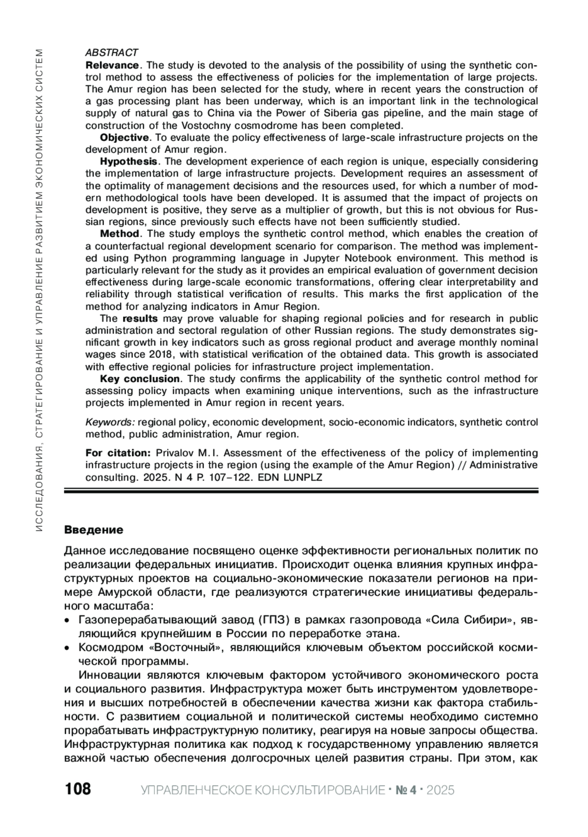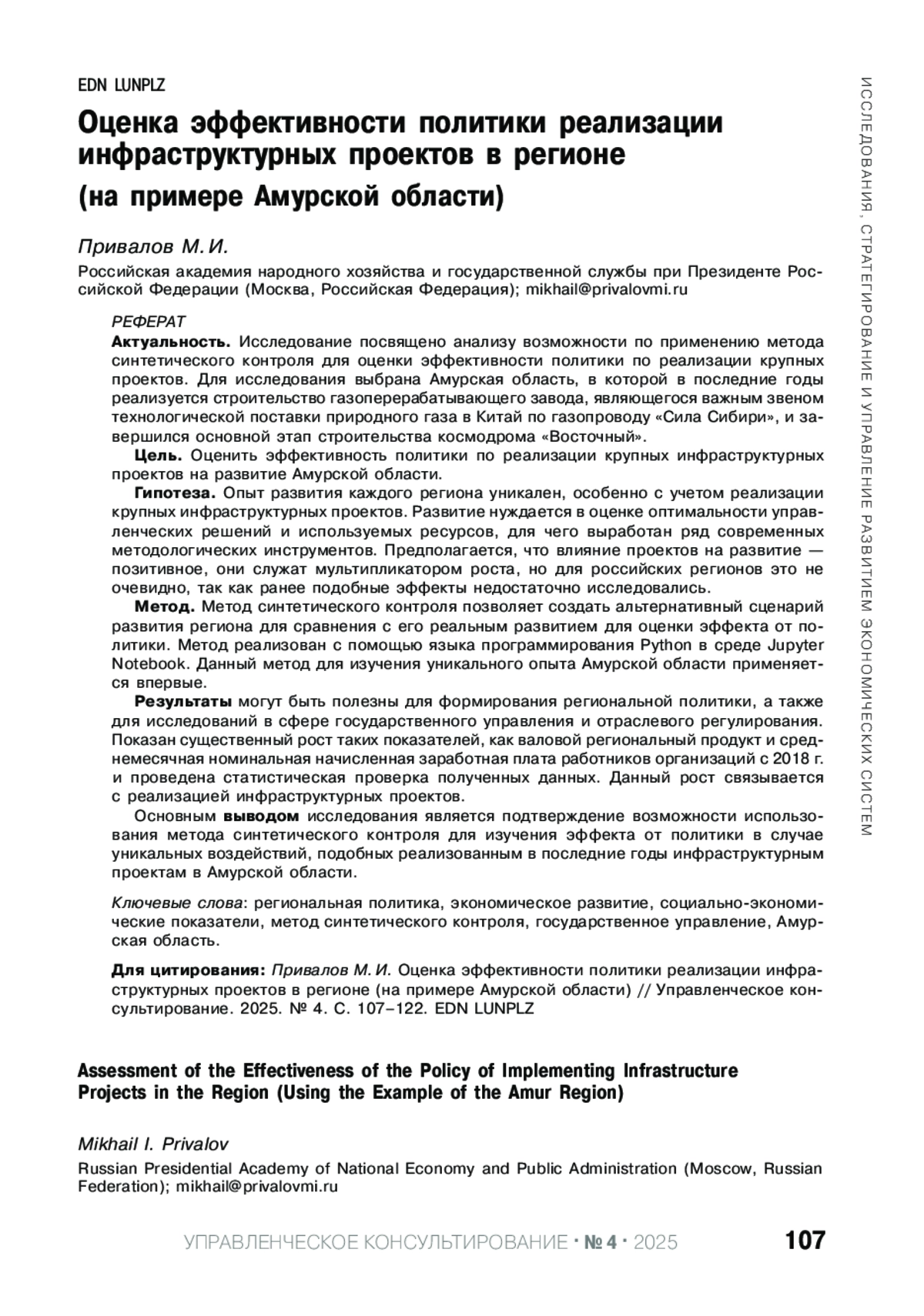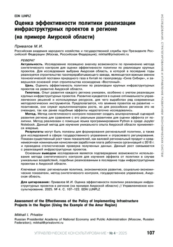 ПРИВАЛОВ М. И. ОЦЕНКА ЭФФЕКТИВНОСТИ ПОЛИТИКИ РЕАЛИЗАЦИИ ИНФРАСТРУКТУРНЫХ ПРОЕКТОВ В РЕГИОНЕ (НА ПРИМЕРЕ АМУРСКОЙ ОБЛАСТИ) // УПРАВЛЕНЧЕСКОЕ КОНСУЛЬТИРОВАНИЕ. 2025. № 4 (190)