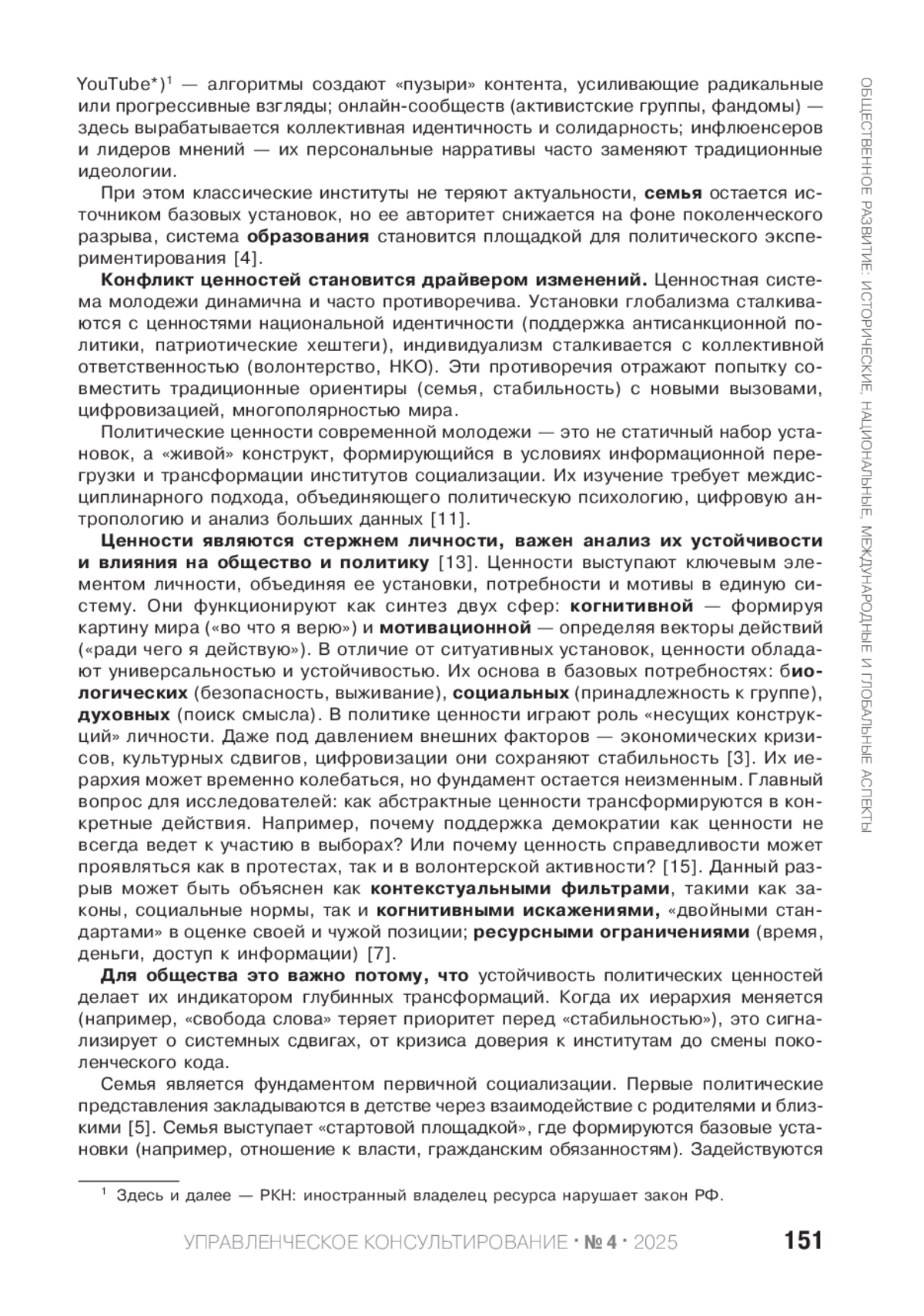 11. Мельникова О.В. Социокультурные ценности и правовые представления, взгляды молодежи в современных условиях трансформации общества // Нравственные императивы российской государственности: достоинство личности, суверенитет, солидарность : Сборник научных трудов Первого Белгородского международного юридического форума. В 2 т., Белгород, 11-12 сентября 2024 года. Белгород : Белгородский государственный национальный исследовательский университет, 2024. С. 354-359.